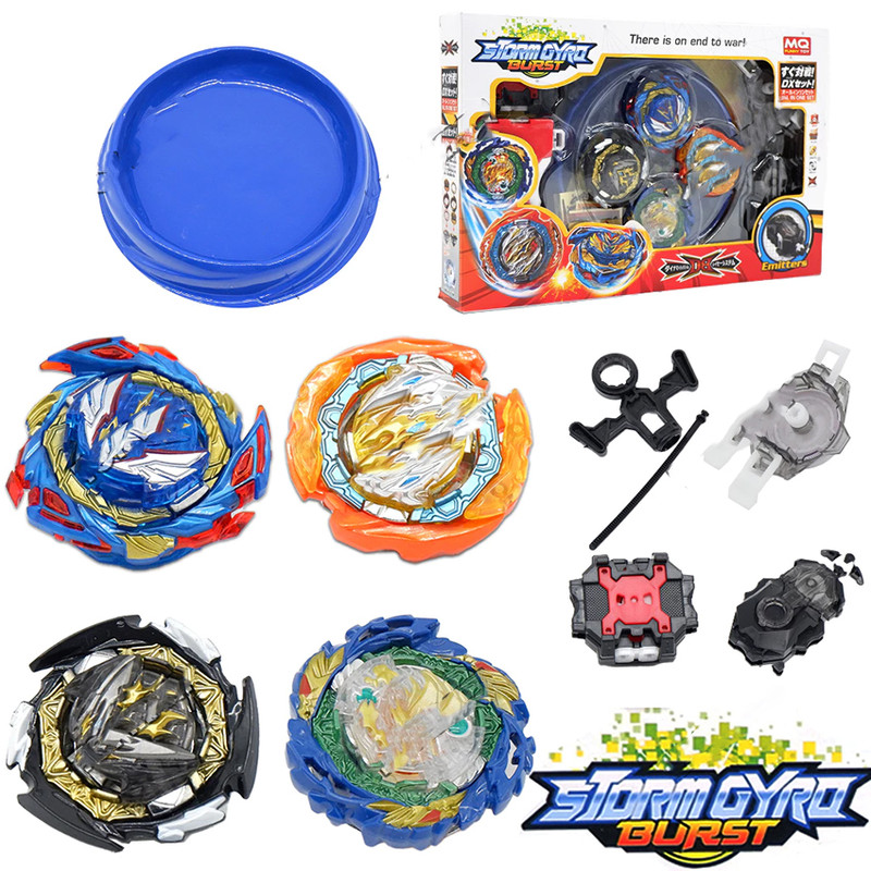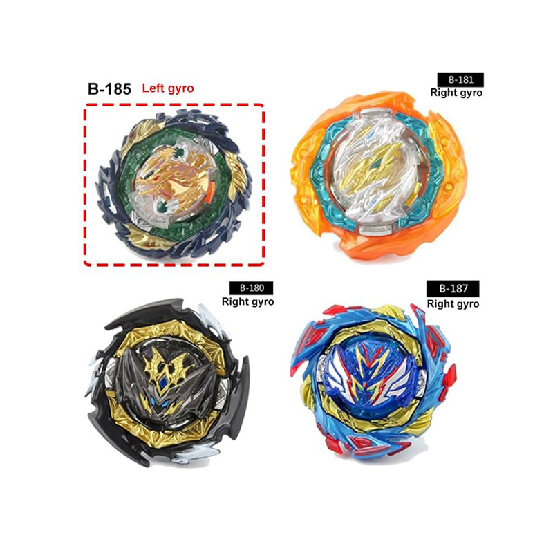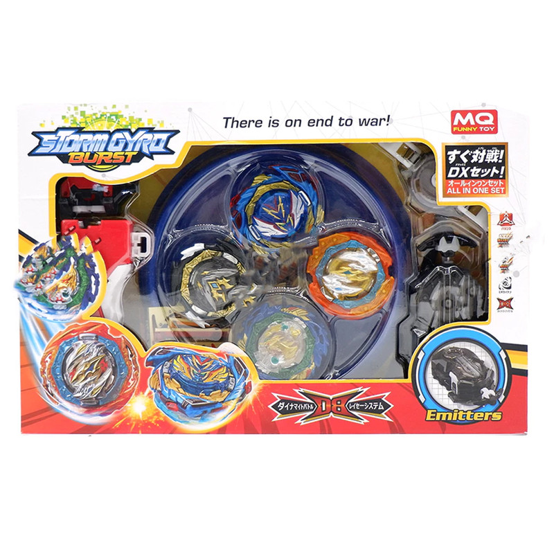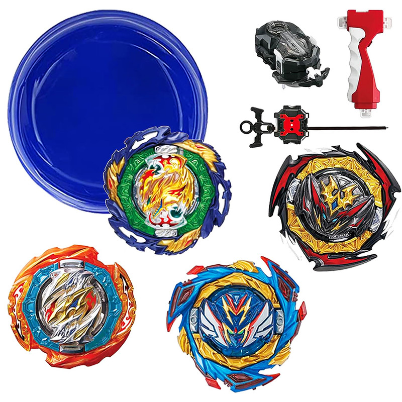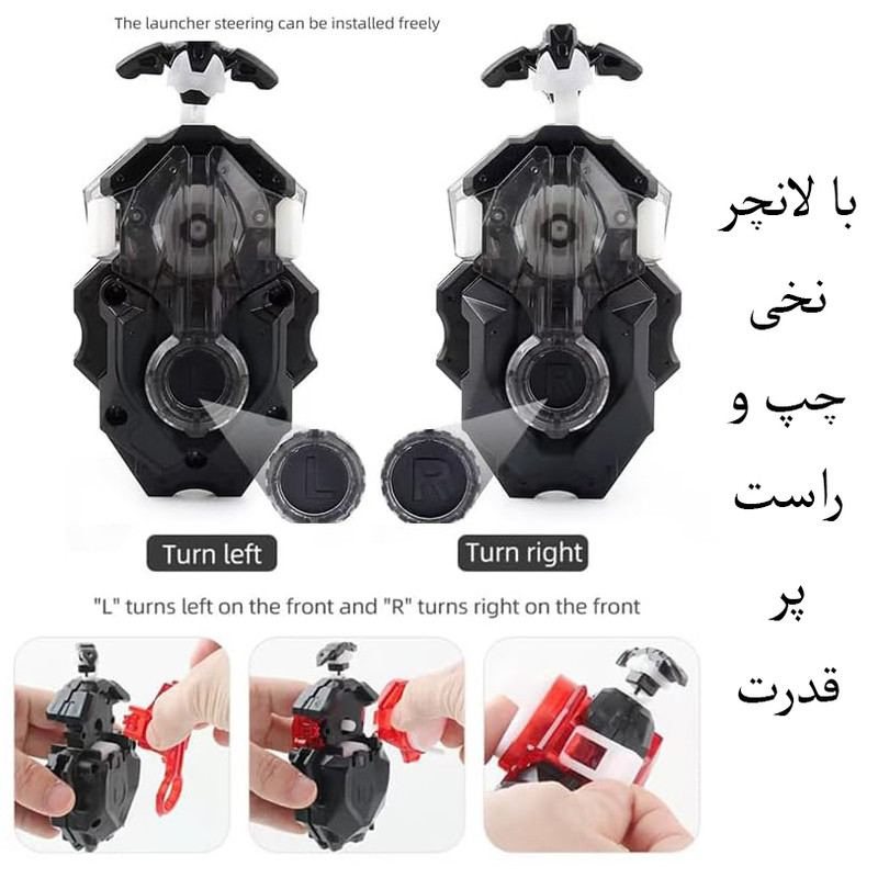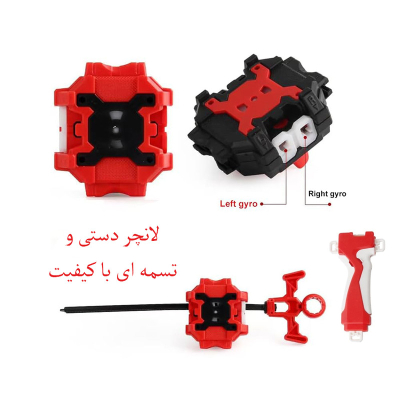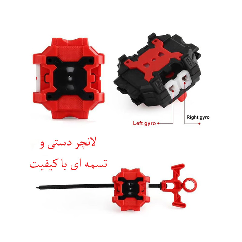 اقلام همراهبسته شامل: 4x فرفره چرخان. 2x لانچر نخی چپ و راست دسته لانچر تسمه ای به همراه تسمه؛ به همراه زمین بازی و برچسب ها -