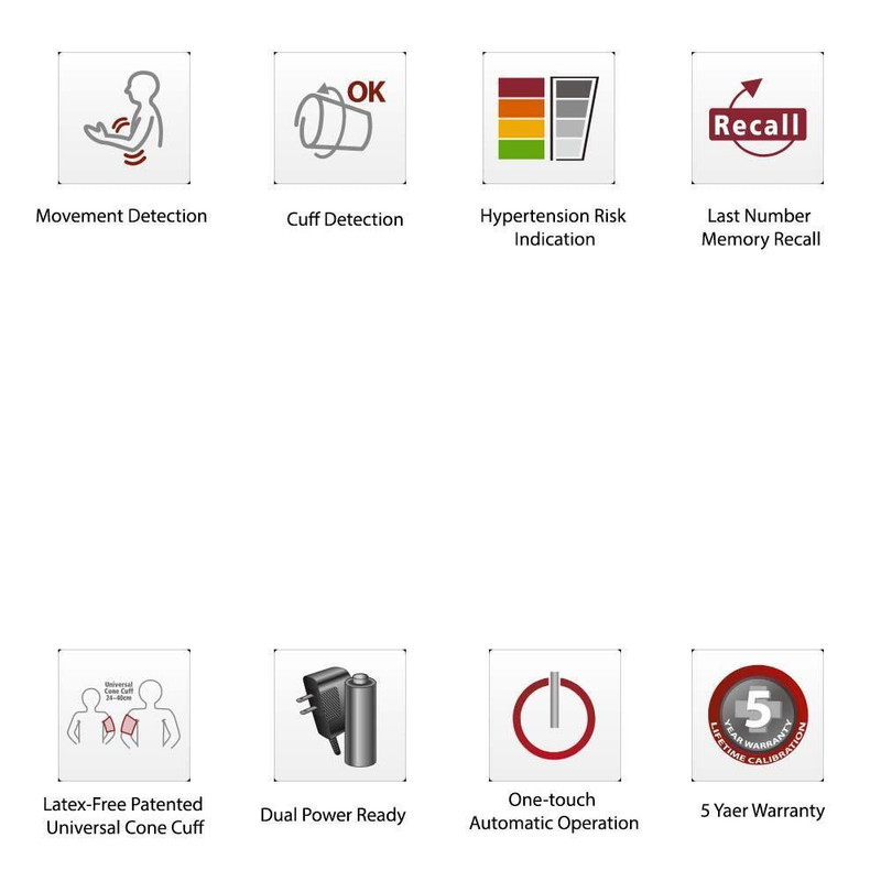 | سایر توضیحات | قابلیت خاموشی خودکار در صورت عدم استفاده قابلیت تشخیص ضربان قلب نامنظم (IHB) مجهز به تکنولوژی Real Fuzzy قابلیت تشخیص درست بسته شدن کاف مجهز به سیستم تشخیص حرکت دارای 90 حافظه برای ذخیره نتایج سایز کاف 24 تا 40 سانتی متر قابلیت نمایش میزان ضربان قلب دارای کالیبراسیون مادام العمر قابلیت نمایش میانگین سه نتیجه آخر |