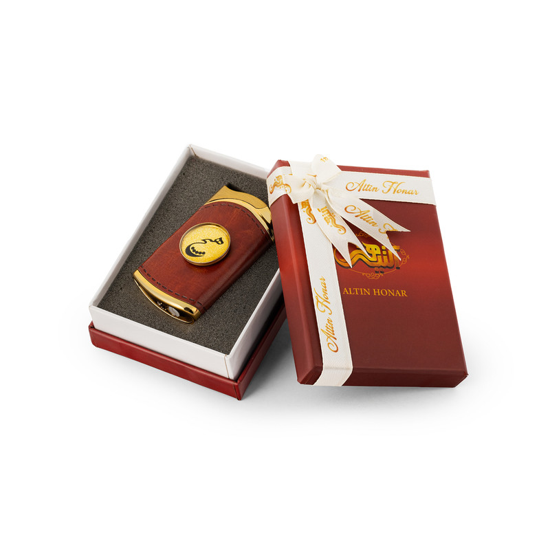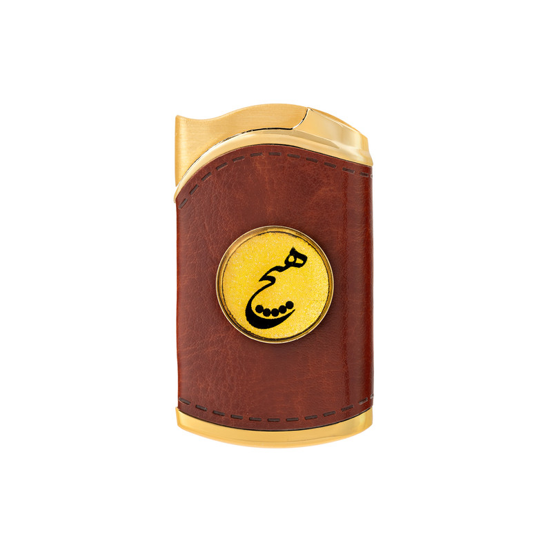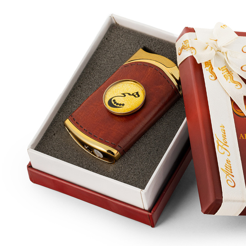 فندک لوکس طرح خاص با ترکیب چرم و آبکاری طلا، انتخابی شیک و متفاوت برای دوستداران لوازم خاص و لاکچری است. بدنه این فندک از فلز مقاوم ساخته شده و بخشهایی از آن با آبکاری طلا جلوهای براق و ماندگار پیدا کرده است. روی بدنه با روکش چرمی قهوهای پوشیده شده که علاوه بر زیبایی، حس لوکس و خوشدستی بیشتری به محصول میدهد. در قسمت جلویی فندک، نشان دایرهای طلایی رنگ با طرح خوشنویسی کلمه «هیچ» قرار گرفته که جلوهای خاص و هنری به محصول بخشیده است.