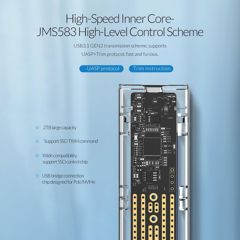 یکی از مدلهای محبوب هارد، SSD است. این مدلها نسبت به هاردهای عادی سرعت بسیار بیشتری دارند. هاردهای معمولی دارند. این هاردها معمولا به صورت اینترنال یا همان داخلی در لپتاپ یا کامپیوتر قرار میگیرند. اگر قصد دارید SSD را به هارد قابل حمل تبدیل کنید باید از قاب یا بکس تبدیل استفاده کنید. یکی از برندهایی که در زمینه تولید قاب هارد فعالیت دارید اوریکو است. قاب NVMe M.2 SSD مدل TCM2-C3 یکی از محصولات این برند معتبر است. بدنه این مدل از آلیاژ آلمینیوم ساخته شده است. استفاده از این جنس باعث شده تا مقاومت این قاب بالاتر رفته و آسیبی به SSD وارد نشود. این قاب میتواند تا ظرفیت 2 ترابایت را پشتیبانی کند که این میزان برای محصولی به این اندازه استاندارد و مطلوب است. نصب SSD روی این قاب تنها 4 مرحله دارد. این مدل از ویژگی Plug and Play بهرهمند شده است. این ویژگی بدین معناست که برای استفاده از این قاب نیازی به نصب نرمافزار ندارید و فقط کافیست این قاب را به دستگاه متصل کنید.