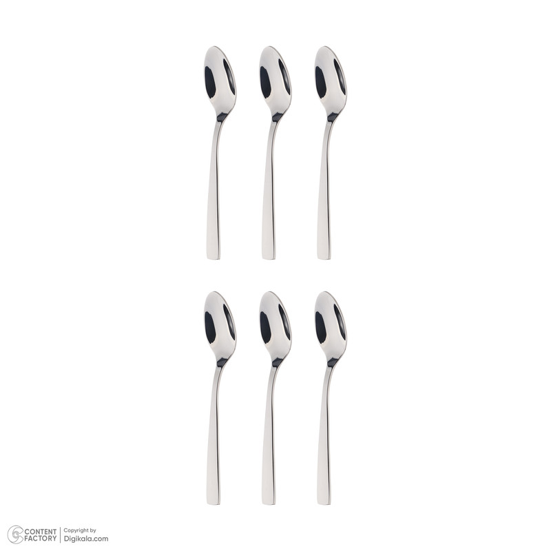 سایر توضیحات 6 عدد قاشق قهوه خوری به ابعاد 9×2×2 سانتی‌متر و وزن 10 گرم/استیل 18/10 ضدزنگ
