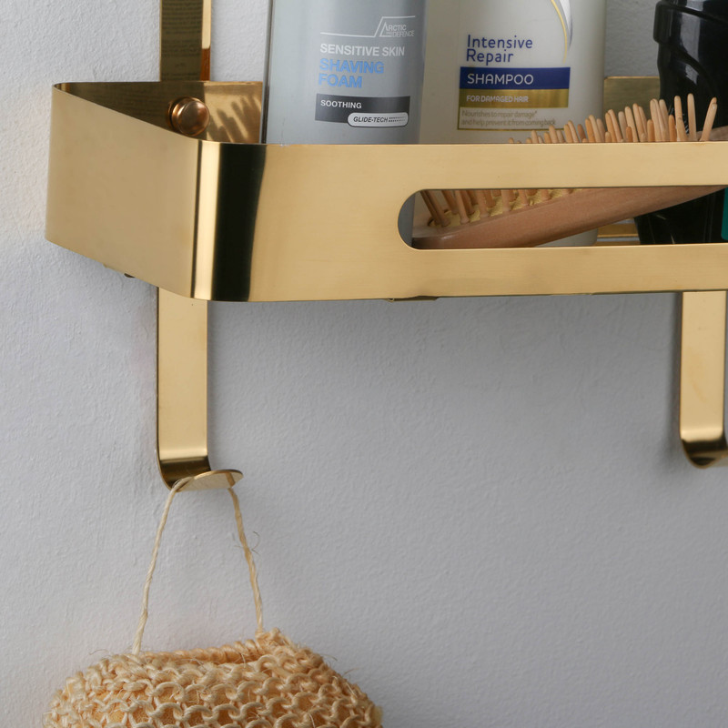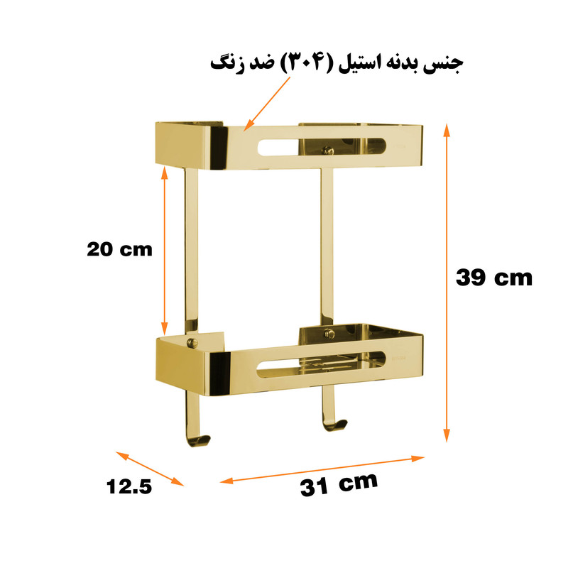 طبقه حمام مدل «KH-V-2-G» با برند «دلفین» (DOLPHIN) . معمولا یکی از مشکلاتی که در محیط های رطوبتی مثل حمام و دستشویی با آن مواجه هستیم زنگ زدگی و تجمع آب زیر و روی لوازم است. طبقه حمامی دلفین با استفاده از متریال استیل ضد زنگ و همچنین مشبک بودن سطح نگهدارنده برای خروج آب این مشکل را رفع نموده است. جای لیف در قسمت بیرونی اجازه گردش هوا و در نتیجه جلوگیری از تجمع باکتری را ممکن ساخته است. ظاهری زیبا ،نصب آسان وفضای زیاد برای قرار دادن شوینده ها و لوازم اصلاح از ویژگی های این محصول است. شستشو و قرار دادن این طبقه کنار دوش به واسطه جنس ضد زنگ آن نظافت لوازم را ساده تر کرده است. این محصول به فورم های 2 طبقه، 3طبقه و در رنگ های کروم و طلا ارایه شده و متریال تمام رنگ ها استیل است.