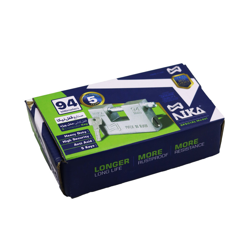 سایر توضیحات | - قفل کتابی نیکا مدل ویژه - برند: نیکا - مدل: ویژه - نوع: کتابی - سایز: 94 میلی متر - ابعاد: 100×70×30 میلی متر - وزن: 1005 گرم - جنس: فولاد - روکش: آبکاری کروم - کلید: 5 کلید کامپیوتری - رنگ: نقره ای - کیفیت بالا - دارای سیلندر تمام برنجی |