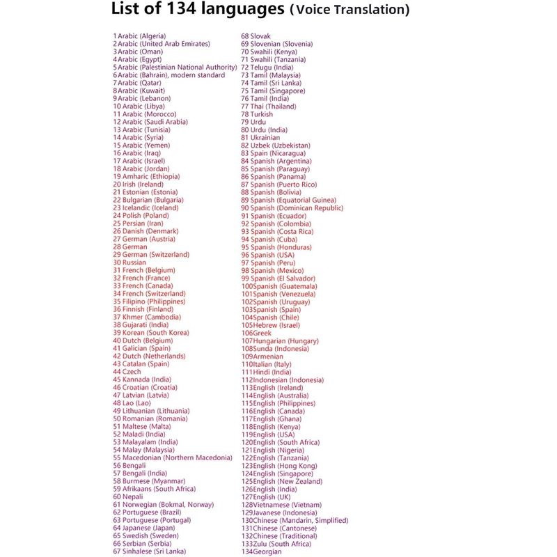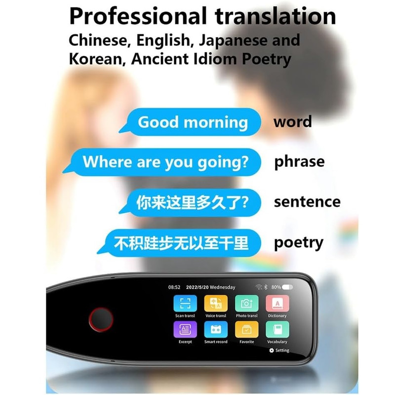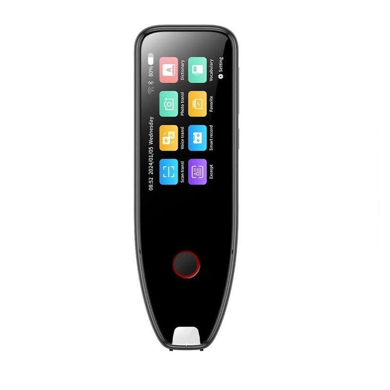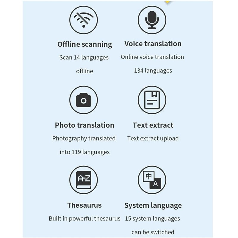سایر مشخصاتقلم مترجم هوشمند همراه دو دوربین : اسکن به متن: قلم اسکنر قدرتمند، با عملکردهایی مانند اسکن ترجمه‌ها، ترجمه زبان‌ها، ترجمه تصویر، ضبط هوشمند، کتابخانه کلمات و غیره. قلم اسکنر می‌تواند متن را اسکن و ترجمه کند و سرعت اسکن آن می‌تواند کل خطوط متن را در عرض چند ثانیه ترجمه کند. هنگام حرکت سریع و صاف در یک خط مستقیم در سمت چاپ شده، بهترین عملکرد را دارد و دقت ثبت تا ۹۸٪ است. ترجمه دوطرفه زبان: قلم ترجمه فرهنگ لغت از ترجمه آنلاین به ۱۱۳ زبان مانند انگلیسی، چینی، فرانسوی، آلمانی، ایتالیایی، ژاپنی و غیره پشتیبانی می‌کند و در صورت عدم وجود شبکه، ۱۲ زبان را می‌توان به صورت آفلاین ترجمه کرد. مترجم خوانده شده دارای دقت بالای ۹۸٪ برای مکالمات سریعتر در ۹۵٪ از کشورهای جهان است. استفاده آسان: قلم ترجمه مجهز به یک صفحه لمسی ۳ اینچی است که استفاده از آن آسان است، فقط کافی است آن را به Wi-Fi یا هات اسپات متصل کنید تا ترجمه شود و از ترجمه آفلاین پشتیبانی می‌کند. پورت اسکن مترجم خوانش دیجیتال از پلاستیک ساخته شده است که در طول فرآیند اسکن هیچ اثری روی کاغذ صاف باقی نمی‌گذارد. قلم اسکنر از اسکن متن روی کاغذ، صفحه نمایش دیجیتال، پوستر و غیره پشتیبانی می‌کند. متن به گفتار: این اسکنر، متن را همزمان با اسکن شما می‌خواند. تلفظ انسانی به بهبود گوش دادن و صحبت کردن کمک می‌کند و کمکی مؤثر برای افراد مبتلا به نارساخوانی یا سایر مشکلات خواندن است. سفر، مطالعه، کار: قلم ترجمه فرهنگ لغت کوچک و قابل حمل است، مناسب برای سفر، سفرهای کاری، زبان آموزان خارجی و زبان آموزان، با باتری 1500 میلی آمپر ساعتی و حافظه 8 گیگابایتی، می‌توانید از آن در هر مکانی به طور مستقل استفاده کنید - کتابخانه، کلاس درس، دفتر یا در حال حرکت.