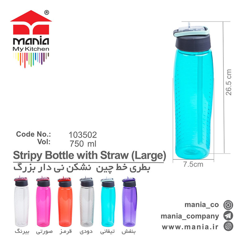 این محصول سایز بزرگ بطری های ورزشی طرح خط چین نی دار است. روی درِ بطری دهانه تاشو جهت نوشیدن تعبیه شده که به نی داخل بطری متصل می شود. این بطری نشکن بوده و مناسب جهت استفاده در ورزشگاه، مدرسه و دانشگاه، مسافرت، پیک نیک و... خواهد بود. همچنین حداکثر دمای مجاز برای این بطری ها 70 درجه سانتی گراد و حجم این محصول 750 میلی لیتر است.