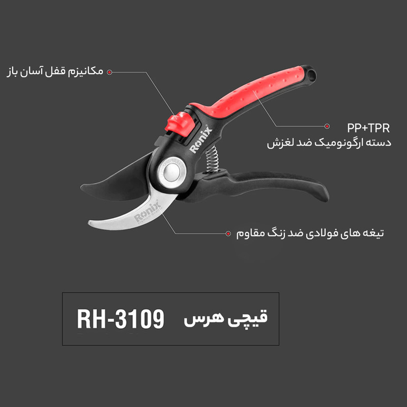 اگر به عنوان يك باغبان حرفه اى فعاليت مى كنيد يا به دنبال لحظات خوشى در معاشرت با گل وگياهان هستيد، حتماً اهميت يك قيچى باغبانى باكيفيت را درك كرده ايد. اين ابزار ممكن است به عنوان مهم ترين ابزار باغبانى محسوب شود؛ زيرا تنوع و محدوده كاربردهاى آن به اندازه اى وسيع است كه انجام بسيارى از فعاليت هاى باغبانى بدون آن تقريباً غير ممكن مى شود. قيچى باغبانى مدل RH-٣١۰٩ از برند رونيكس، باطراحی ايمن و اتصالات قوى بين دسته وتيغه، به عنوان يك ابزار با دوام و كيفيت بالا شناخته مى شود. اين قيچى باغبانى از نظر ايمنى و كارايى در رشته باغبانى بسيار توانمند است.
