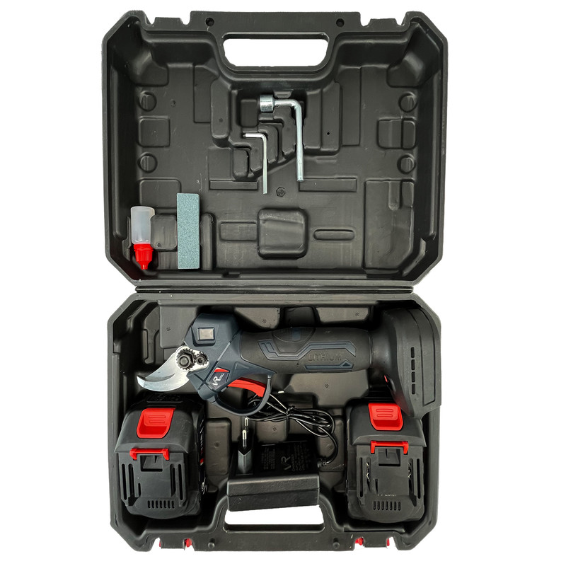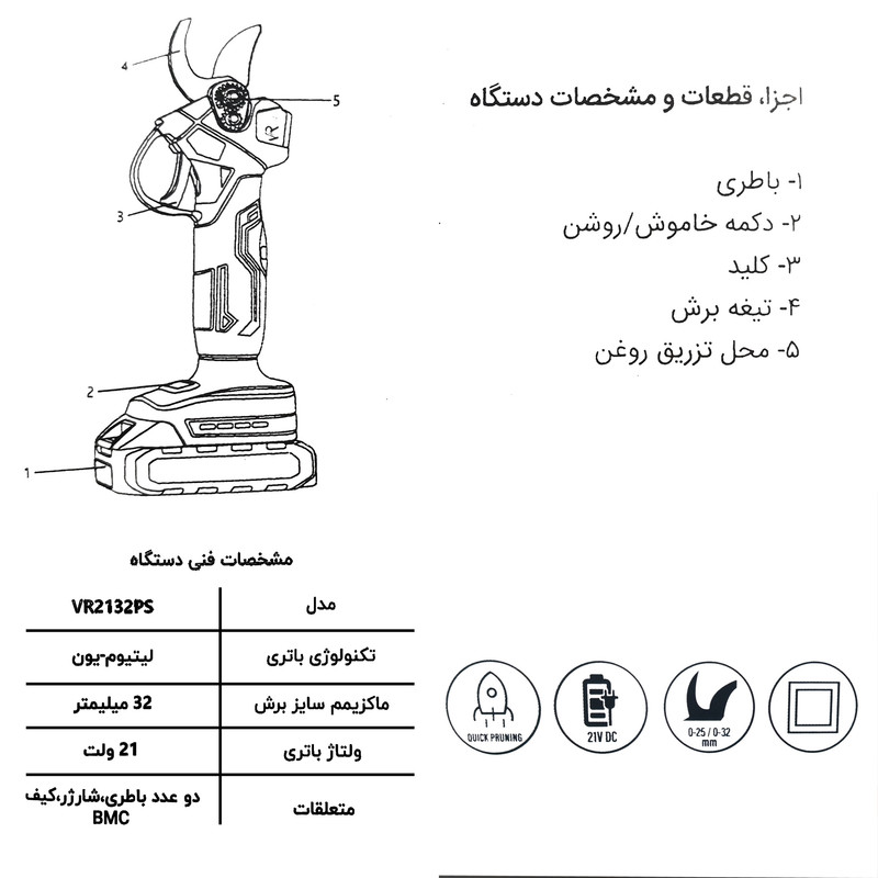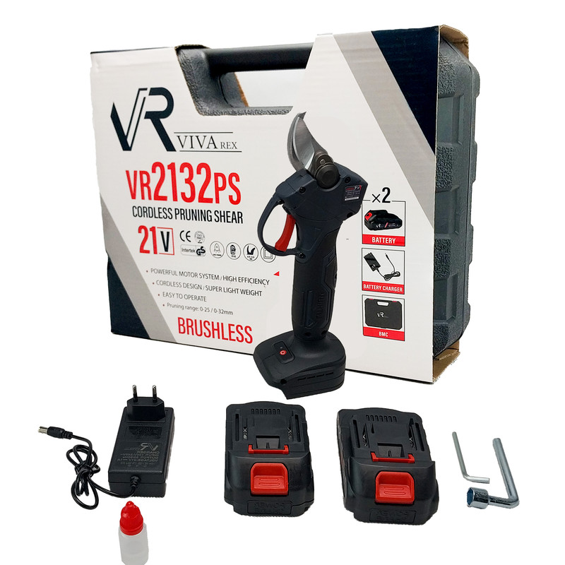یکی از جدیدترین و کارآمدترین ابزار آلات باغبانی هرس، قیچی های هرس شارژی هستند. با توجه به طاقت فرسا بودن هرس، این قیچی ها برای باغداران و هرس کاران ایرانی بسیار جذاب هستند.قیچی هرس باغبانی شارژی با باتری لیتیوم-یون کار می کند(دارای 2 عدد باتری 21 ولت).و شاخه هایی با حداکثر قطر 32 میلیمتر را بدون آسیب رساندن به گیاه به راحتی هرس میکند.باتری های قیچی شارژی لیتومی میباشد. یعنی ساختاری مشابه باتری موبایل دارند. این باتری ها از عمر بالایی برخوردار هستند. قیچی شارژی باغبانی ویوارکس یکی از جدیدترین ابزارهایی شارژی است که هرس کاران و باغداران می توانند از آن استفاده کنند. قیچی باغبانی شارژی ویوارکس با تیغه 2.5 سانت از محصولات با کیفیت شرکت ویوارکس است.این قیچی باغبانی شامل دو باتری لیتیوم-یونی است که از متریال بسیار با کیفیت و مقاوم ساخته شده است. با هربار شارژ باتری به مدت 1.5 ساعت می توان حدود 3 ساعت فعالیت هرس کاری را انجام داد. وزن این ابزار با الحاق باتری در حدود 1 کیلوگرم است.به همین دلیل کار هرس کاری را به شدت آسوده میکند.قیچی شارژی ویوارکس مدل (VR2132PS) به علت بالا بودن کیفیت ساخت و قدرت بسیار بالای آن یکی از پر طرفدار ترین کالا در دسته ابزار آلات باغبانی می باشد.اقلام همراه قیچی 2 عدد باتری لتیوم-یون، شارژر، کارت گارانتی، آچار آلن، آچار بکس، روغن، تیغه تیز کن، و دفتر چه راهنمای فارسی میباشد که تمامی اقلام در یک کیف مستحکم BMC خدمت مشتریان عزیز ارسال میشود.برای شروع کار دستگاه ابتدا دکمه پاور قرمز رنگ را فشار دهید سپس 2 بار پشت سر هم شاسی قرمز رنگ قیچی را فشار دهید قیچی آمادهی برش کاری میباشد.