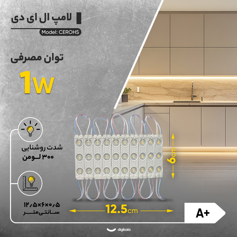لامپ ال ای دی بلوکی 12 ولت مدل CEROHS مجموعه 10 عددی بلوکهایی با 3 عدد لامپ بهطور موازی به هم متصل شده و با ولتاژ 12 ولت تولید نور میکند. این مجموعه از قسمت پشت به چسب دو طرفه مجهز است که میتوان آن را به سطوح صاف فلزی و شیشه و ... متصل و تثبیت کرد. تعداد بسیار زیادی از این مجموعهها را میتوان از هر دو سمت به هم متصل کرد و در انتها با اتصال به ولتاژ 12 ولت با جریان متناسب، روشنایی یکنواخت و مناسبی را ایجاد کرد. توان این مجموعه ال ای دی 24 وات است و به جریان 2 آمپر با ولتاژ 12 ولت برای تغذیه ، نیاز دارد. از این محصول میتوان در تابلوهای چلنیوم، ماشین و هر جا که برق 12 ولت دارد استفاده کرد.