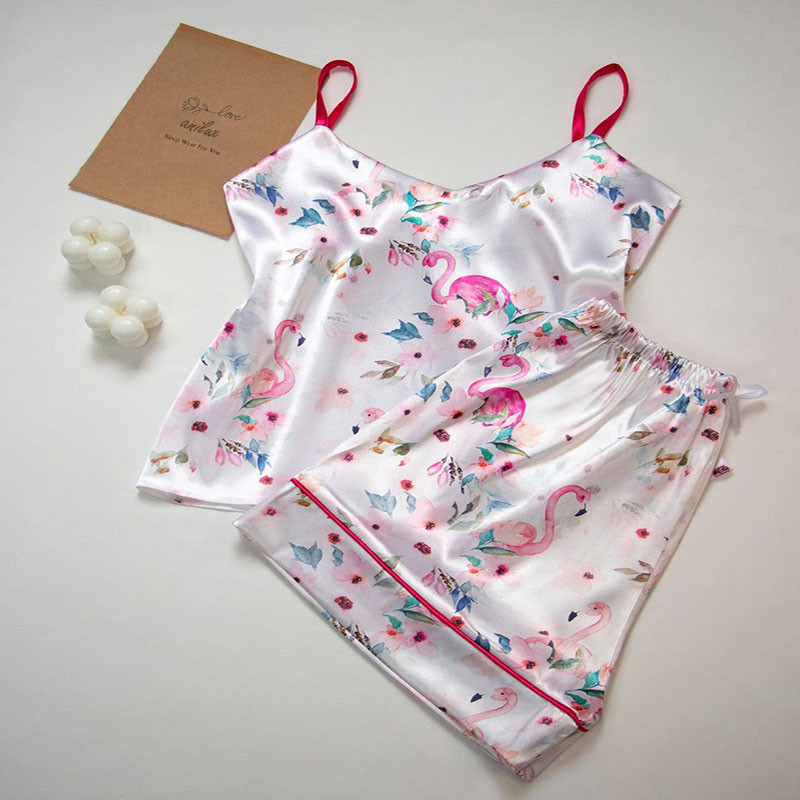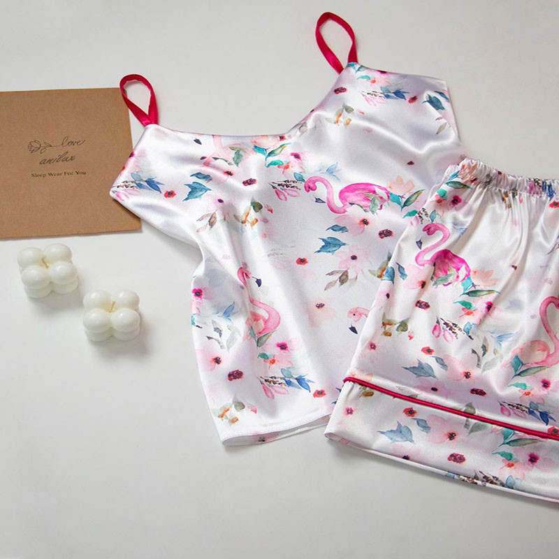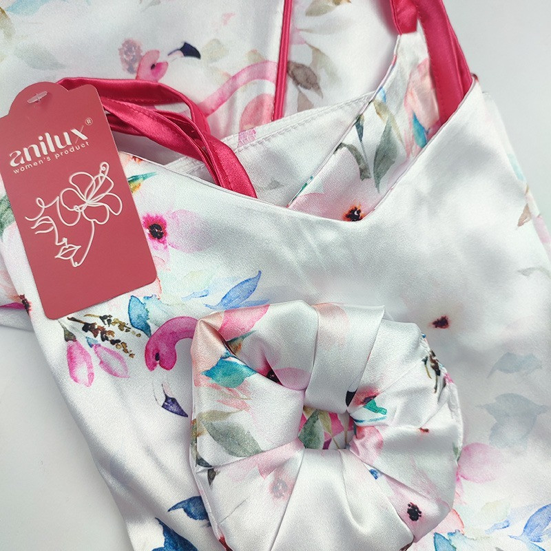 لباس خواب زنانه آنی لوکس مدل ساتن ابریشم طرح فلامینگو کد 66604 به همراه اسکرانچی مو