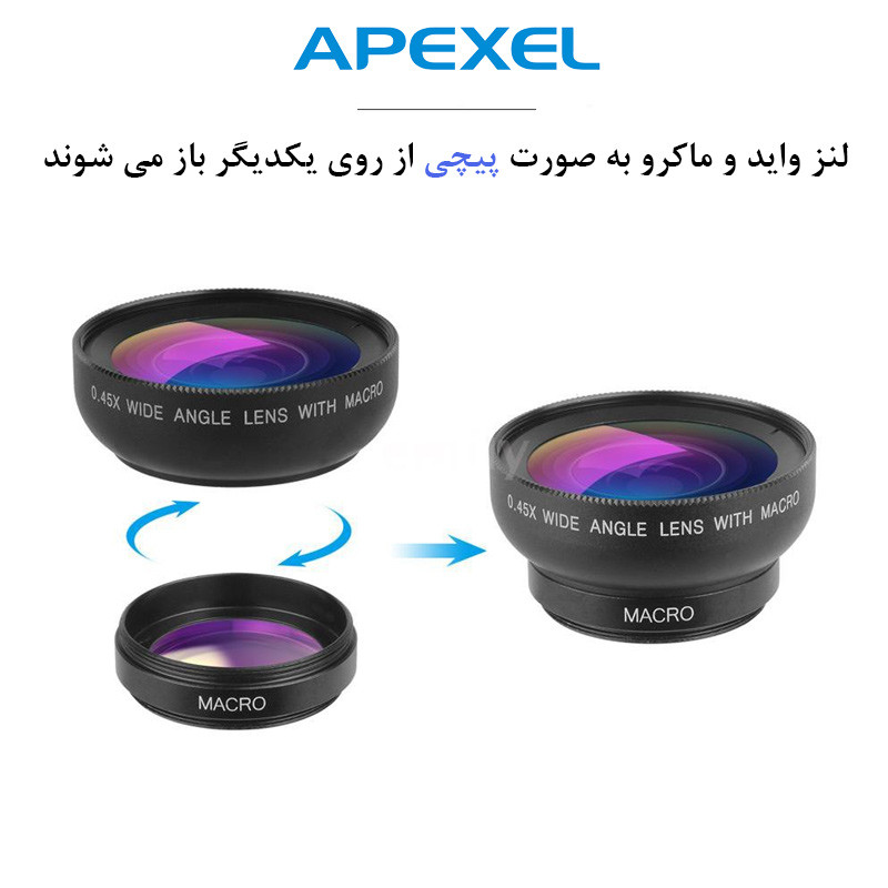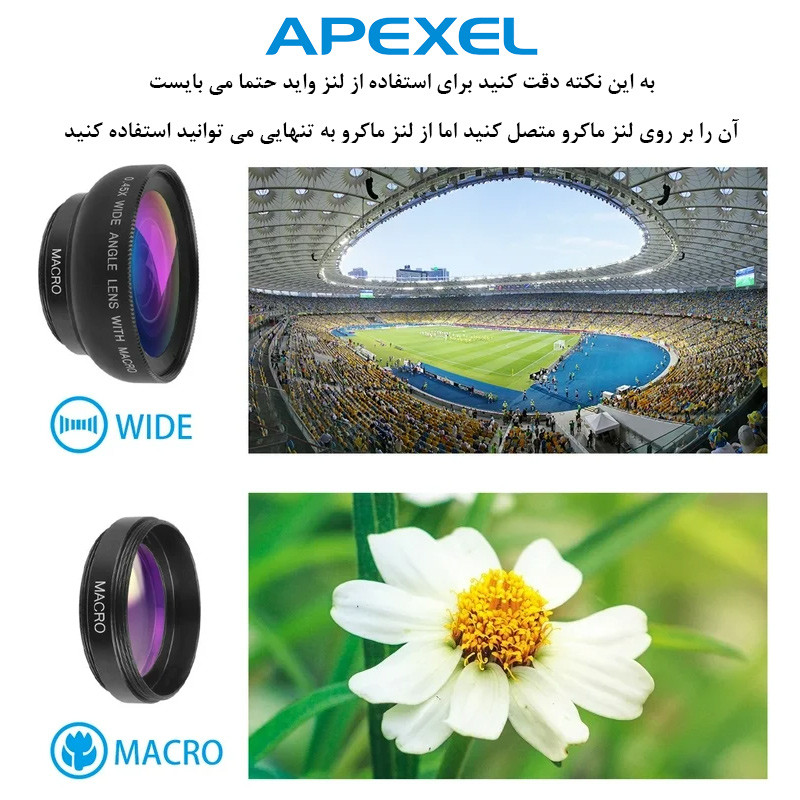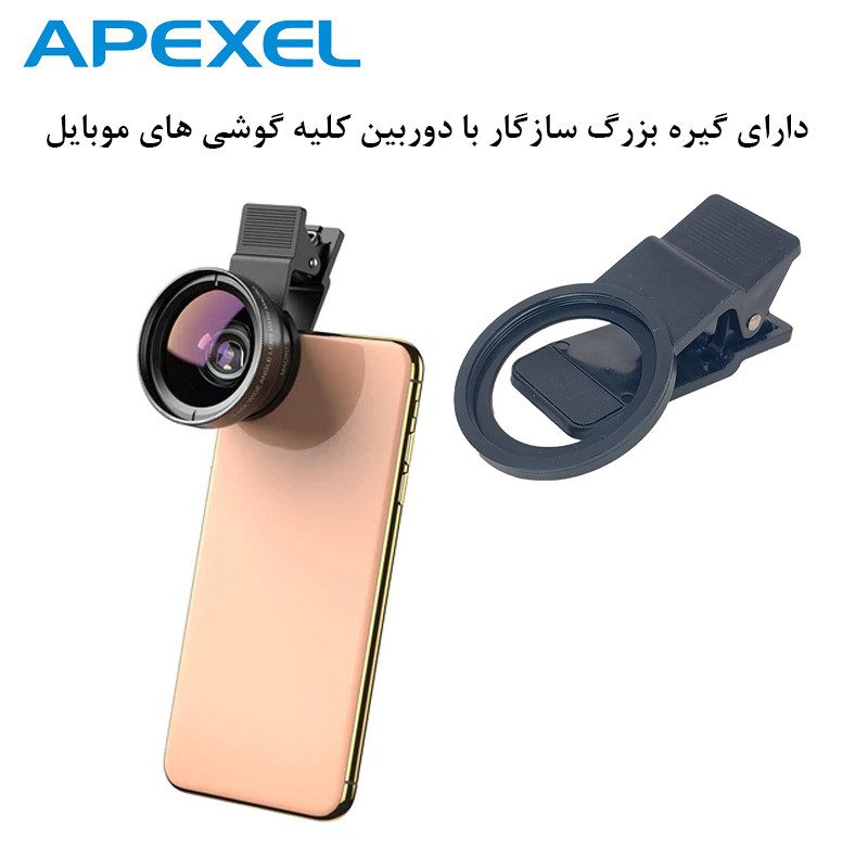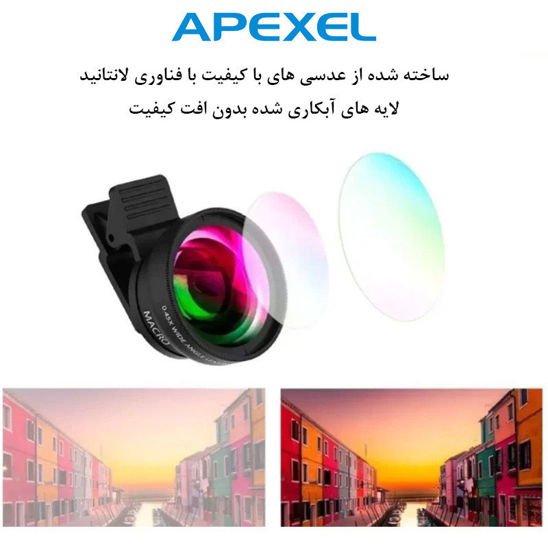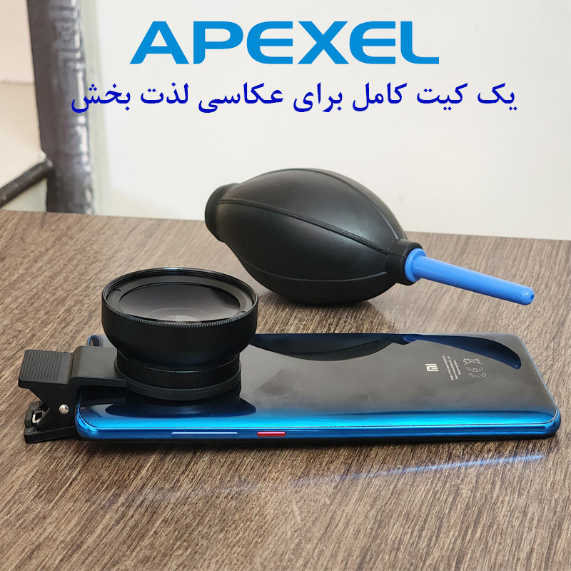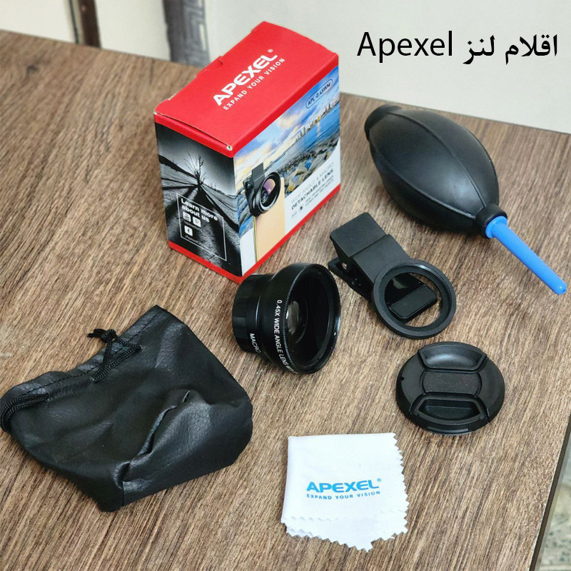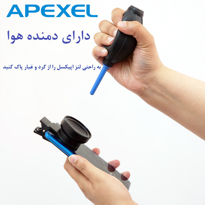 لنز گوشی برای عکاسی از برند اپیکسل به همراه دمنده هوا در واقع دو لنز را در یک لنز ارائه می‌دهد. لنز ماکرو (Macro) با بزرگنمایی 12.5 برابر مستقیم بر روی گیره اتصال لنز موبایل نصب شده است و برای عکاسی ماکرو مناسب است. مزیت این مدل به همراه داشتن یک عدد دمنده هوا برای تمیز نگه داشتن لنز اپکسل و همچنین پاک کردن گرد و غبار قبل از عکاسی از لنز دوربین گوشی موبایل است. از این دمنده هوا می توانید برای پاک کردن گرد و غبار از لنز و دوربین های حرفه ای عکاسی نیز استفاده کنید.اما لنز واید (Wide) یا زاویه باز به سطح بالایی لنز ماکرو متصل می‌شود و بزرگنمایی 0.45 برابر را ارائه می‌دهد. لنز موبایل اصلی APL-0.45WM دارای ساختار آلومینیوم و همچنین پوشش چندلایه بر روی شیشه است. از لنز موبایل اپیکسل می‌توان برای عکاسی در طبیعت، Landscape، معماری، سلفی با خانواده و دوستان، عکاسی در سالن های زیبایی ، تولید محتوا و عکاسی ماکرو استفاده نمود. یکی دیگر از کابردهای لنز ماکرو در این پکیج، عکاسی از ابرو، مژه و ناخن برای آرایشگران و ناخن‌کارها و همچنین تتوکاران حرفه‌ای است. همچنین عکاسی از جواهرات و بدلیجات از دیگر کابردهای لنز ماکرو اپیکسل است.APEXEL APL-0.45WM یک لنز 2 در 1 قابل جدا شدن است. گیره نگهدارنده لنز به گونه ای طراحی شده است که با اکثر تلفن های هوشمند سازگار است.با استفاده از لنز ماکرو می‌تواند در فاصله 3 تا 6 سانتیمتر از سوژه فوکوس کرده و عکس ماکرو بگیرید. زاویه دید لنز واید اپیکسل، 140 درجه است و برای عکاسی از بناهای تاریخی، منظره و … می‌تواند از آن استفاده نمایید.نکته های مهم : قبل از اتصال لنز اپیکسل حتما قاب گوشی خود را جدا کنید در برخی از مدلهای گوشی ممکن است در اطراف کادر عکس سیاهی ایجاد شود . در صورتی که اطراف عکس سیاهی مشاهده کردید تنظیمات دوربین خود را از کادر 4:3 به 1:1 و یا 19:9 تغییر دهید.فاصله فوکوس لنز ماکرو بین 3 تا 6 سانتی متر است.لنز ماکرو به تنهایی قابل استفاده است اما برای استفاده از لنز واید می بایست آن را حتما بر روی لنز ماکرو استفاده کنید. لنزها به صورت پیجی از روی یکدیگر باز می شوند.
