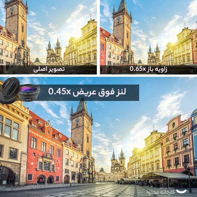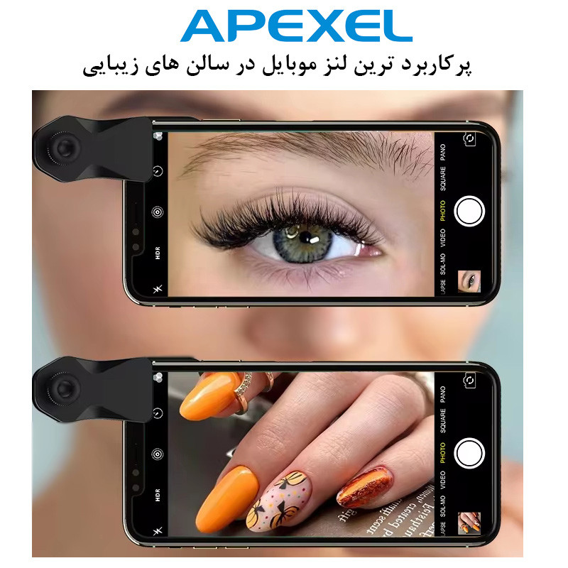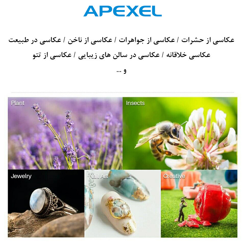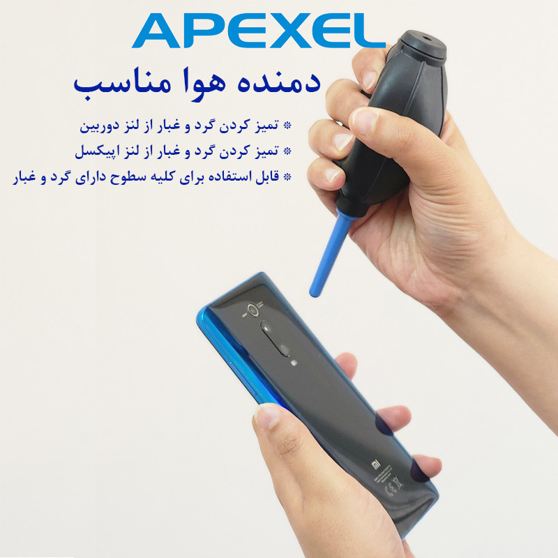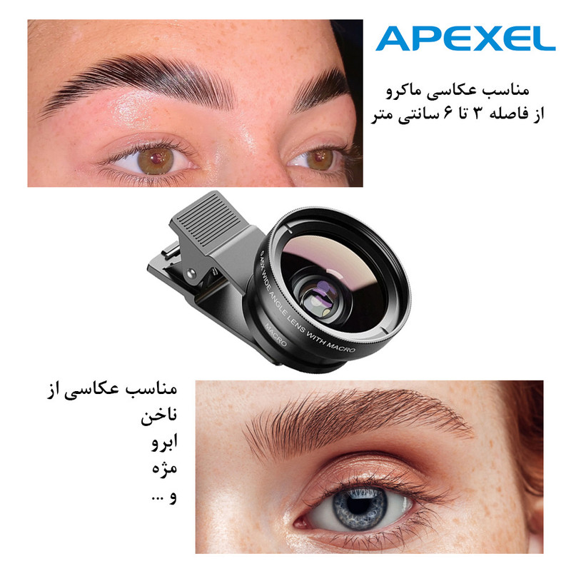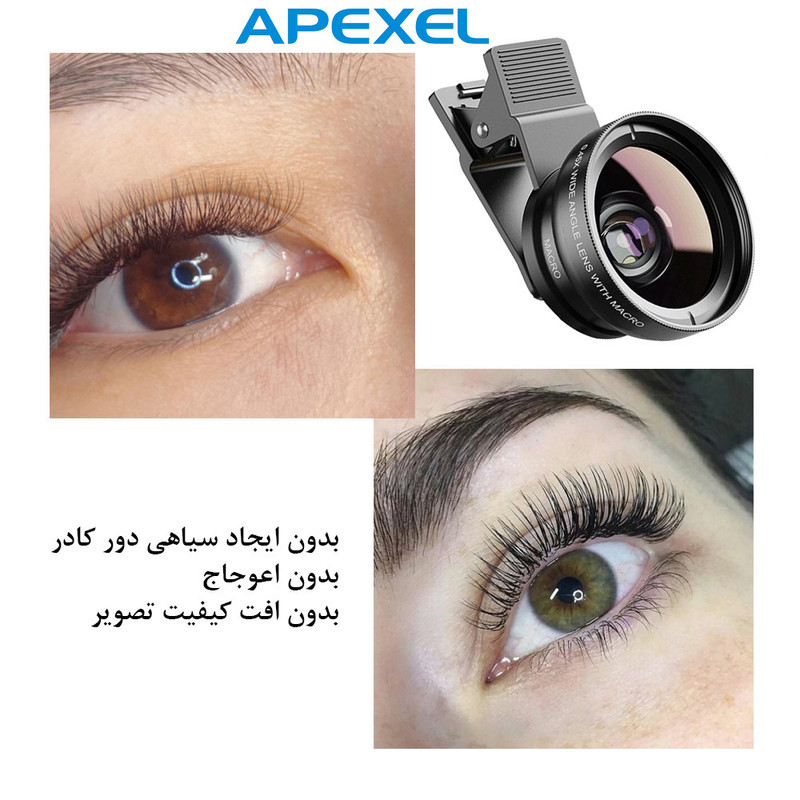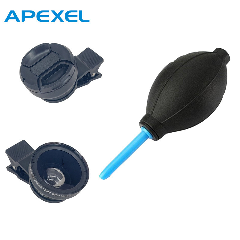 لنز گوشی برای عکاسی از برند اپیکسل به همراه دمنده هوا در واقع دو لنز را در یک لنز ارائه می‌دهد. لنز ماکرو (Macro) با بزرگنمایی 12.5 برابر مستقیم بر روی گیره اتصال لنز موبایل نصب شده است و برای عکاسی ماکرو مناسب است. مزیت این مدل به همراه داشتن یک عدد دمنده هوا برای تمیز نگه داشتن لنز اپکسل و همچنین پاک کردن گرد و غبار قبل از عکاسی از لنز دوربین گوشی موبایل است. از این دمنده هوا می توانید برای پاک کردن گرد و غبار از لنز و دوربین های حرفه ای عکاسی نیز استفاده کنید.اما لنز واید (Wide) یا زاویه باز به سطح بالایی لنز ماکرو متصل می‌شود و بزرگنمایی 0.45 برابر را ارائه می‌دهد. لنز موبایل اصلی APL-0.45WM دارای ساختار آلومینیوم و همچنین پوشش چندلایه بر روی شیشه است. از لنز موبایل اپیکسل می‌توان برای عکاسی در طبیعت، Landscape، معماری، سلفی با خانواده و دوستان، عکاسی در سالن های زیبایی ، تولید محتوا و عکاسی ماکرو استفاده نمود. یکی دیگر از کابردهای لنز ماکرو در این پکیج، عکاسی از ابرو، مژه و ناخن برای آرایشگران و ناخن‌کارها و همچنین تتوکاران حرفه‌ای است. همچنین عکاسی از جواهرات و بدلیجات از دیگر کابردهای لنز ماکرو اپیکسل است.APEXEL APL-0.45WM یک لنز 2 در 1 قابل جدا شدن است. گیره نگهدارنده لنز به گونه ای طراحی شده است که با اکثر تلفن های هوشمند سازگار است.با استفاده از لنز ماکرو می‌تواند در فاصله 3 تا 6 سانتیمتر از سوژه فوکوس کرده و عکس ماکرو بگیرید. زاویه دید لنز واید اپیکسل، 140 درجه است و برای عکاسی از بناهای تاریخی، منظره و … می‌تواند از آن استفاده نمایید.نکته های مهم : قبل از اتصال لنز اپیکسل حتما قاب گوشی خود را جدا کنید در برخی از مدلهای گوشی ممکن است در اطراف کادر عکس سیاهی ایجاد شود . در صورتی که اطراف عکس سیاهی مشاهده کردید تنظیمات دوربین خود را از کادر 4:3 به 1:1 و یا 19:9 تغییر دهید.فاصله فوکوس لنز ماکرو بین 3 تا 6 سانتی متر است.لنز ماکرو به تنهایی قابل استفاده است اما برای استفاده از لنز واید می بایست آن را حتما بر روی لنز ماکرو استفاده کنید. لنزها به صورت پیجی از روی یکدیگر باز می شوند.