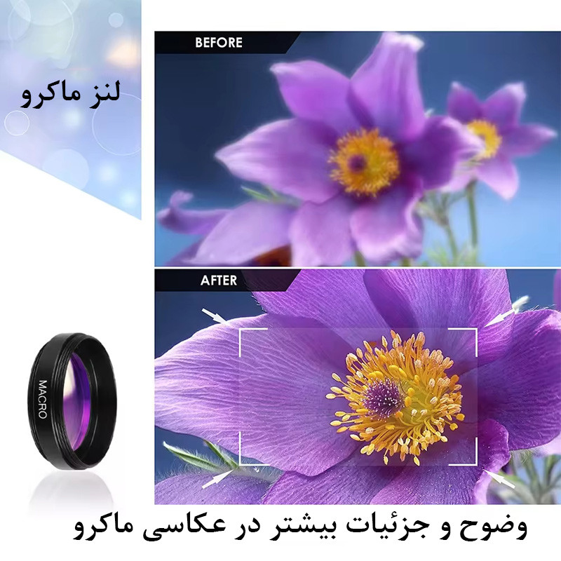 لنز گوشی برای عکاسی از برند اپیکسل به همراه دمنده هوا در واقع دو لنز را در یک لنز ارائه می‌دهد. لنز ماکرو (Macro) با بزرگنمایی 12.5 برابر مستقیم بر روی گیره اتصال لنز موبایل نصب شده است و برای عکاسی ماکرو مناسب است. مزیت این مدل به همراه داشتن یک عدد دمنده هوا برای تمیز نگه داشتن لنز اپکسل و همچنین پاک کردن گرد و غبار قبل از عکاسی از لنز دوربین گوشی موبایل است. از این دمنده هوا می توانید برای پاک...