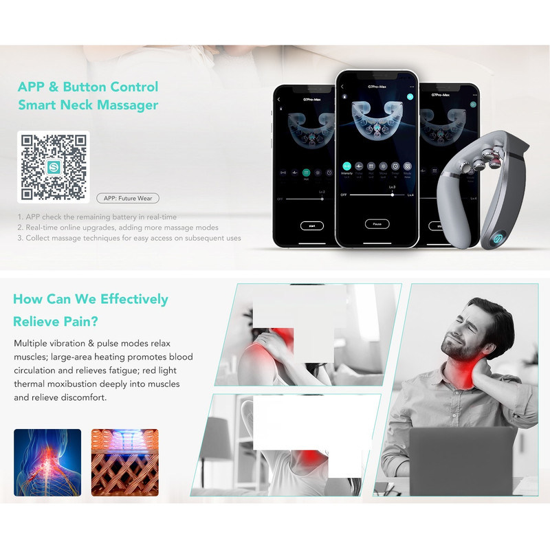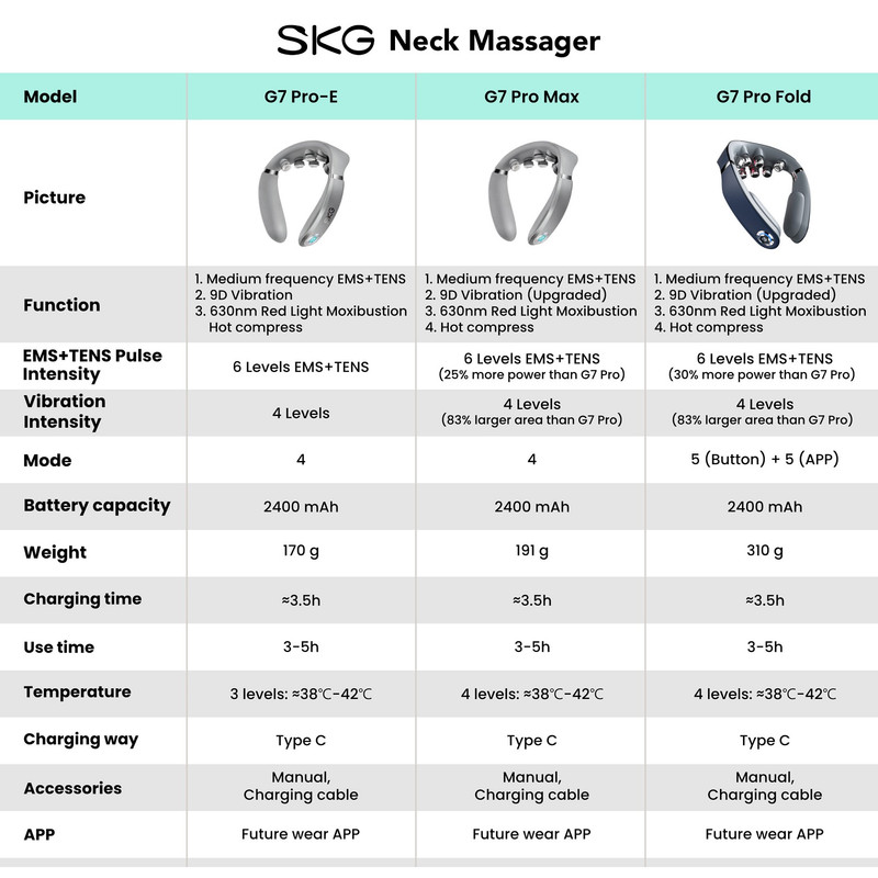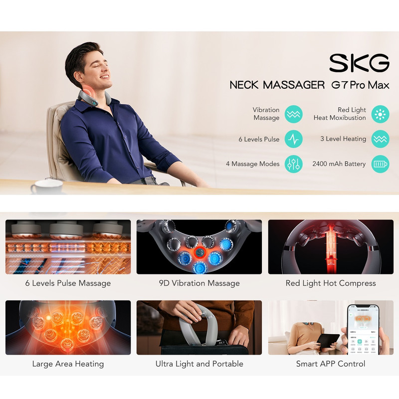 سایر توضیحاتماساژور گردن SKG G7 Pro Max دارای ۹ سر ماساژ نانو ارتقا یافته است که ماساژ بافت‌های سطحی و عمیق را برای تجربه‌ای شدیدتر با ۲۵٪ قدرت بیشتر ارائه می‌دهد. سیستم گرمایش ۱۲۰ درجه‌ای آن، کمپرس‌های گرم تسکین‌دهنده را با سه تنظیم دمای قابل تنظیم ارائه می‌دهد. با وزن تنها ۱۹۰ گرم، G7 Pro Max قابل حمل و راحت است و باتری ۲۴۰۰ میلی‌آمپر ساعتی آن تا ۱۰ روز استفاده را تضمین می‌کند. این دستگاه که برای جایگزینی ماساژورهای سنتی طراحی شده است، دارای ۴ حالت ماساژ و ۳ سطح کمپرس گرم برای یک تجربه ماساژ کامل و همه‌کاره است.