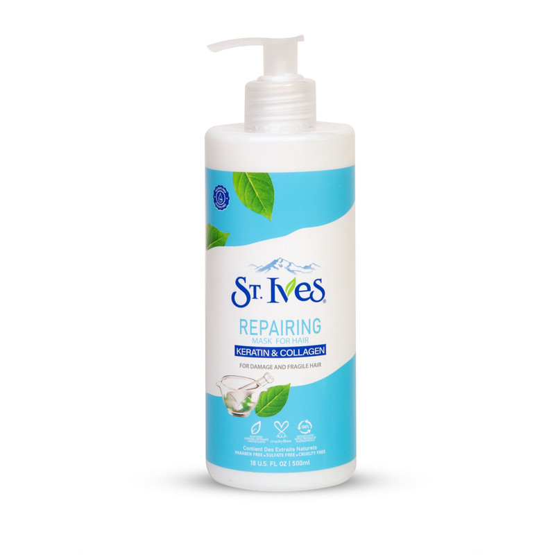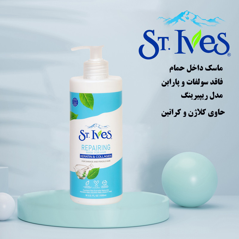 این محصول ماسک مو داخل حمام (با آبکشی)، فری سولفات و پارابن از برند ST.Ives در سری ریپیرینگ (ترمیم کننده) بوده که از پروتئین هیرولیز شده کلاژن و کراتین استفاده شده است.