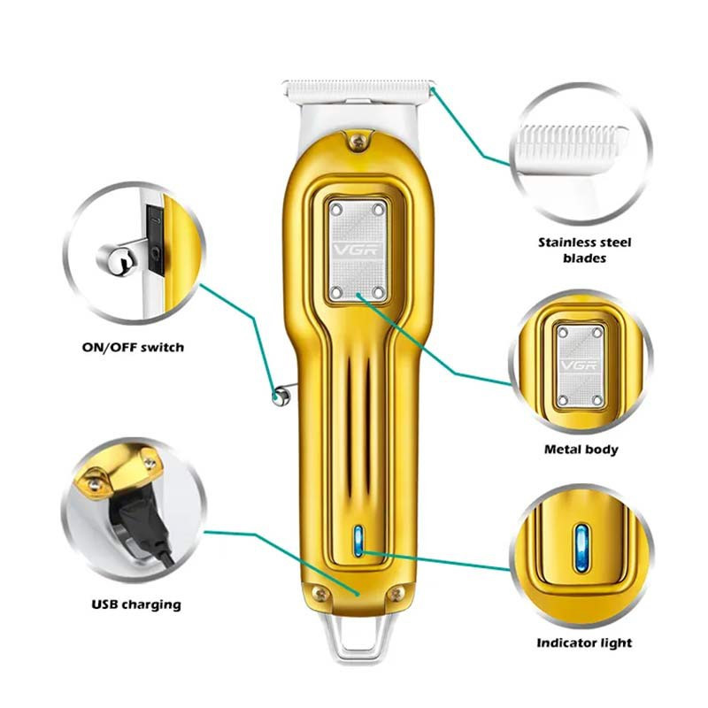 خطزن وی جی ار 919 با تیغههای استیل پیشرفته و طراحی T شکل، با بهرهگیری از جدیدترین تکنولوژی روز ساخته شده است. این دستگاه با وزن تنها 130 گرم، یکی از سبکترین خطزنهای موجود محسوب میشود و در کنار وزن کم، قدرت، سرعت و ظاهری جذاب را نیز ارائه میدهد. وی جی ار 919 به یک باتری لیتیومی 600 میلیآمپری مجهز شده است.این مدل شامل یک پک 8 تکه بوده که در آن خطزن، سه شانه اصلاح در اندازههای 1، 2 و 3 میلیمتری، کابل USB شارژ، درپوش محافظ، برس تمیزکننده و روغن روانکننده قرار دارد. با کمک این شانهها، اصلاح از سایز صفر تا 3 میلیمتر امکانپذیر است که آن را برای سایهزنی ایدهآل میکند. همچنین، این خطزن برای استفاده در محیطهای آرایشگاهی و خانگی کاربرد دارد.