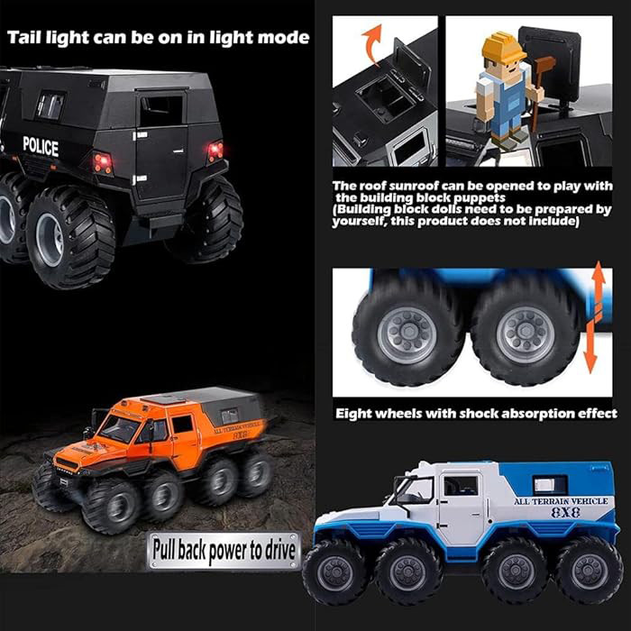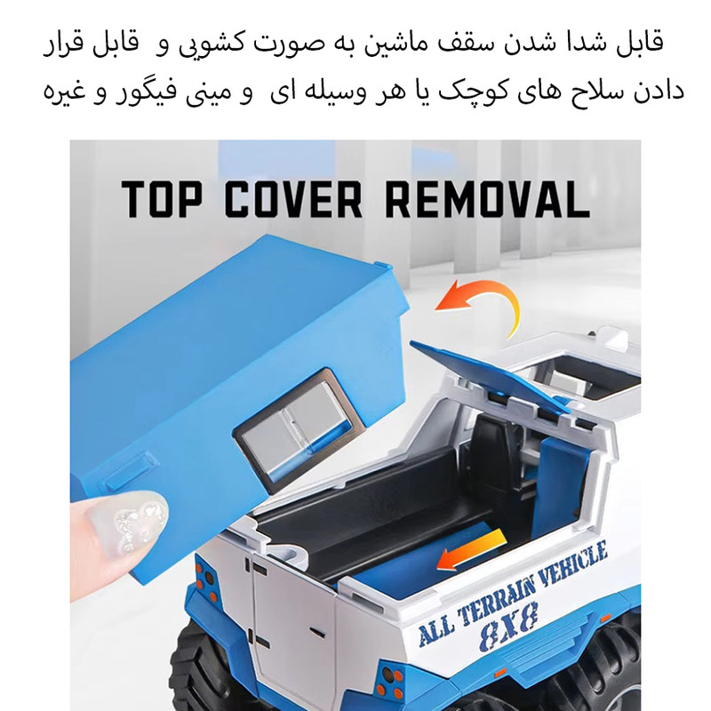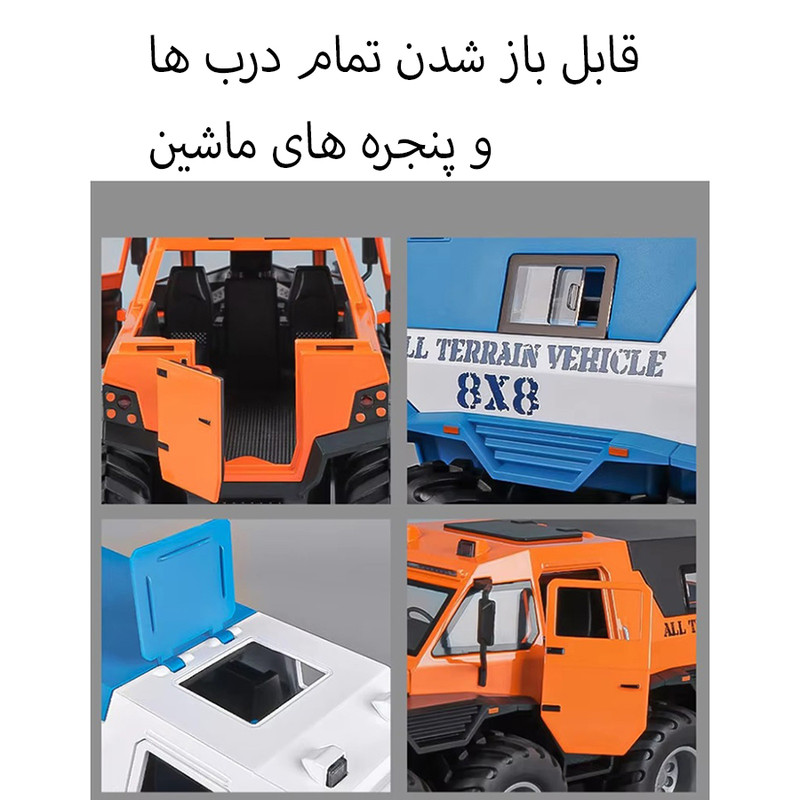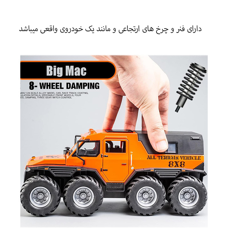 سایر توضیحات - محصولی بسیار جذاب و خاص هیولای افرود 8 چرخ - دارای بدنه فلزی بسیار با کیفیت و خوش ساخت - دارای سقف متحرک و قابل جدا شدن - درب باز شو و پنجره بازشو - دارای چراغ و صدا