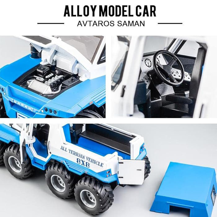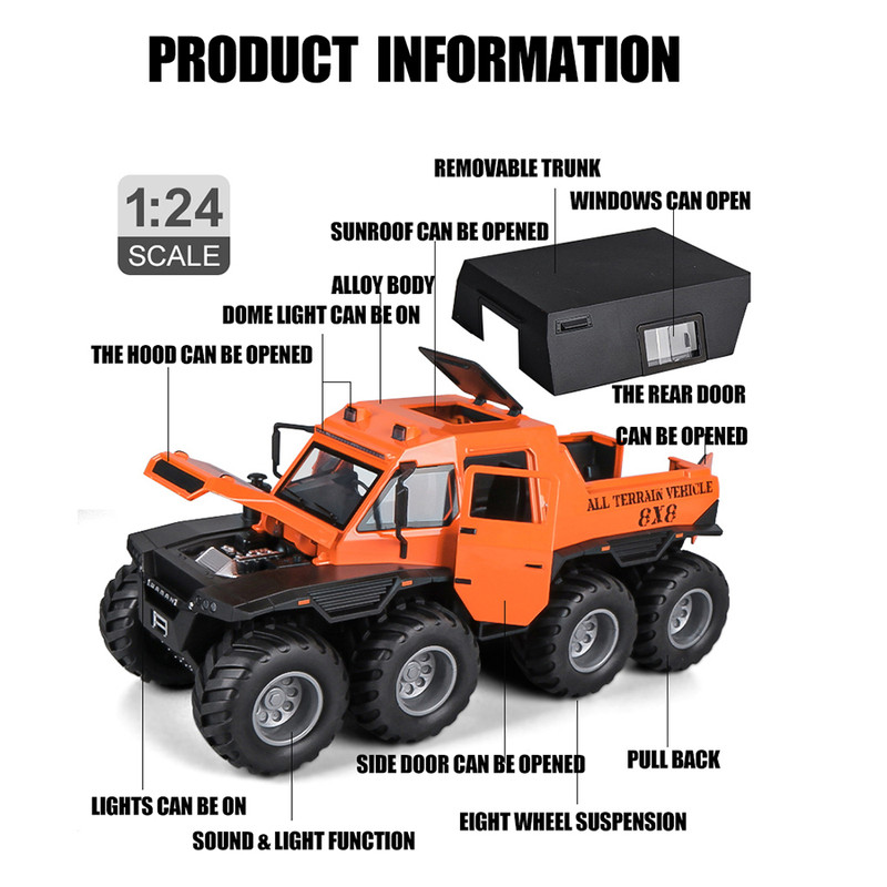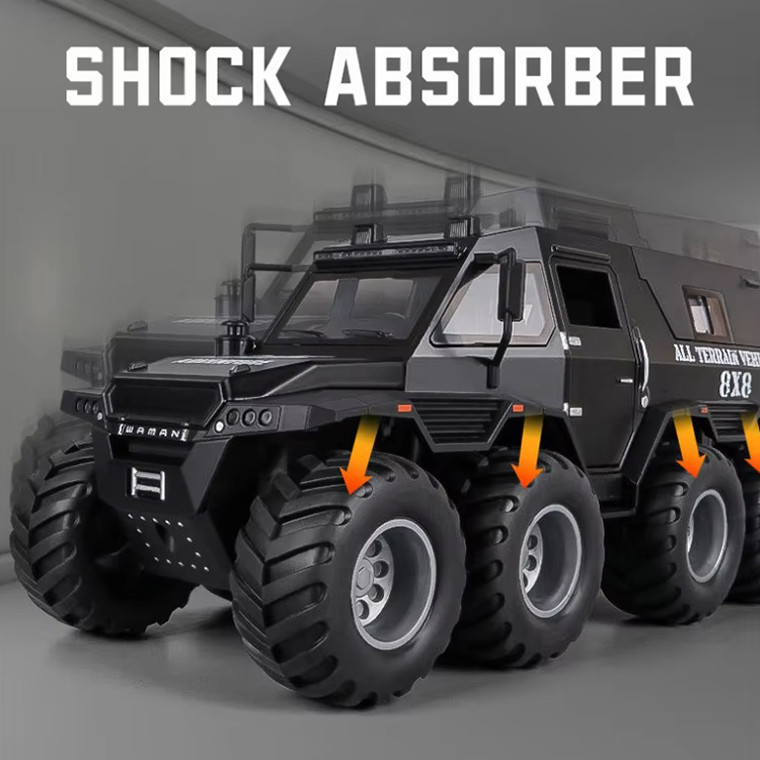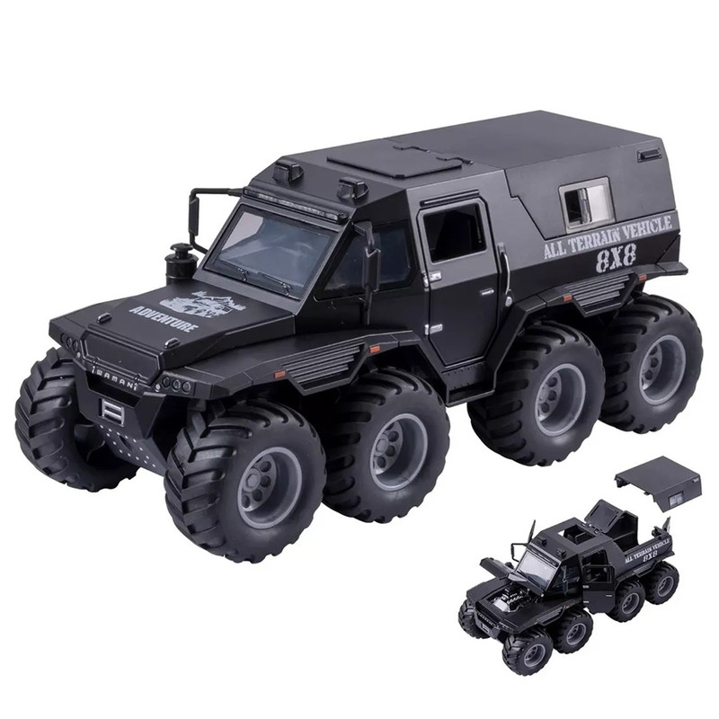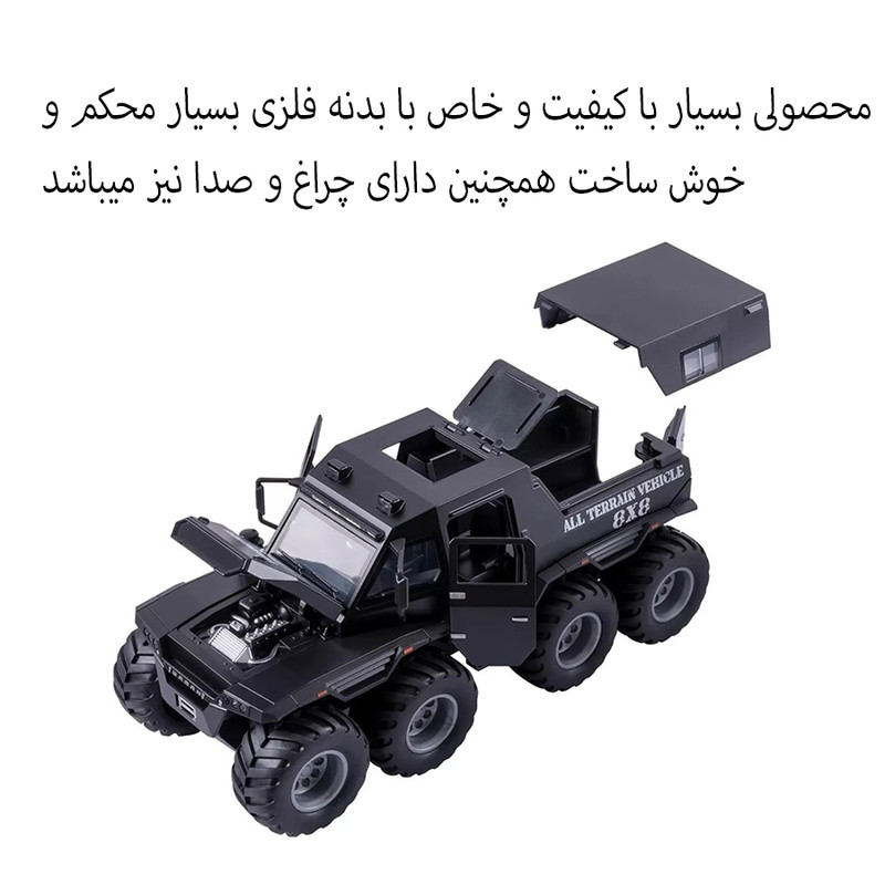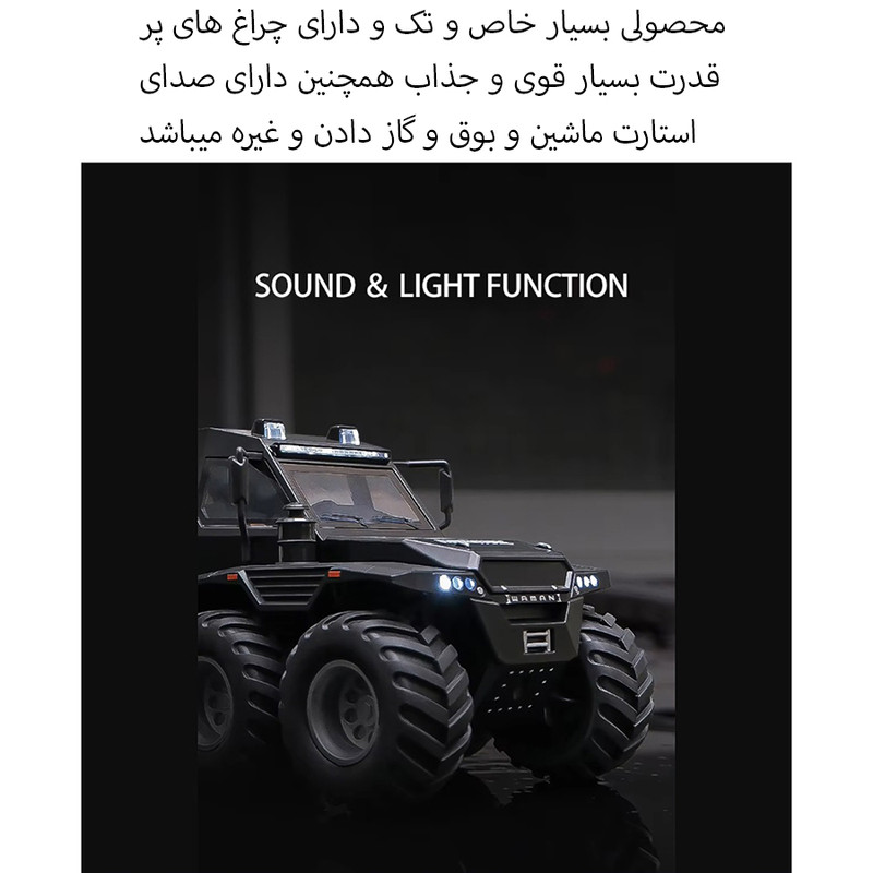 سایر توضیحات- محصولی بسیار جذاب و خاص هیولای افرود 8 چرخ - دارای بدنه فلزی بسیار با کیفیت و خوش ساخت - دارای سقف متحرک و قابل جدا شدن - درب باز شو و پنجره بازشو - دارای چراغ و صدا