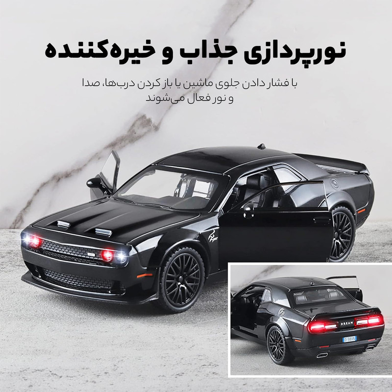 ماکت بسیار زیبای دوج چلنجر هل کت پر مقیاس ۱/۲۴ میباشد تمام دربها باز شو داخل با جزییات کامل دارای فنربندی چرخها فرمانپذیر داری وکیوم باز کردن دربها دو مالت چراغ جلو و عقب .