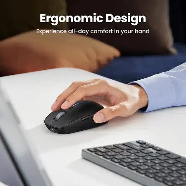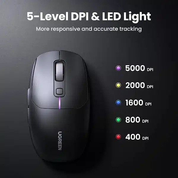 UGREEN MU103 یک موس گیمینگ سبک و چندمنظوره است که هم امکان اتصال سیمی از طریق USB-C را فراهم میکند و هم قابلیت اتصال بیسیم از طریق بلوتوث ۵.۰ و دانگل ۲.۴ گیگاهرتز را دارد. این موس بهویژه برای گیمرها، کاربرهای حرفهای محتوا و دانشجویان طراحی شده و با وزن کم، طراحی ارگونومیک و باتری پرظرفیت ۷۰۰ میلیآمپرساعتی، انتخابی برای عملکرد روزمره و بازی است. با DPI قابلتنظیم تا ۵۰۰۰ و پشتیبانی از سوئیچهای با دوام، MU103 تجربه دقیقی از کنترل موس را برای کاربر ارائه میدهد. بدنه موس پوشش مات و ضد اثر انگشت دارد، این پوشش حتی در استفاده طولانیمدت از لغزش جلوگیری میکند و حس خوبی به کاربر منتقل میکند . سطح موس کمی زبر ولی بدون لبه تیز بوده و ارگونومی آن برای استفاده با حالت کلّی و نوک انگشتی مناسب طراحی شده است. این موس دارای ۶ دکمه کاربردی شامل کلیک چپ/راست، کلید اسکرول، دکمه DPI و دو دکمه جانبی است. کلیکها با کمترین تاخیر بوده و مناسب برای بازی هستند. دکمههای جانبی کاربردهای اضافی همچون Forward/Back را در مرورگر فراهم میکنند. با کابل USB-C، همزمان شارژ و استفاده ممکن است. این حالت مناسب جلسات طولانی و عدم نگرانی بابت باتری است. دانگل USB با فرکانس ۲.۴ گیگاهرتز و قدرت خروجی ۴dBm بردی تا ۱۰ متر فراهم کرده و ارتباط پایدار با نرخ نظرسنجی ۱۰۰۰Hz دارد، اما برخی بررسیها حاکی از تاخیر محسوس در اتصال بیسیم بودهاند. سازگاری با دستگاههای موبایل و سیستمعاملهای مختلف (ویندوز، macOS، لینوکس، اندروید، iOS) از طریق بلوتوث نسخه ۵ فراهم شده و حالت Bluetooth LE برای کاهش مصرف باتری تعبیه شده است. UGREEN MU103 موس گیمینگی همهفنحریف در بازار است که با طراحی ارگونومیک، متریال باکیفیت و وزن سبک، برای کسانی که ورودی استاندارد و قابلاطمینان میخواهند، گزینه بسیار خوبیست. اگرچه برای بازی رقابتی یا استفاده در محیطهایی با نیاز بالا به دقت و حداقل تاخیر طراحی نشده، اما برای استفاده روزمره، اداری و سرگرمی بسیار مناسب است.
