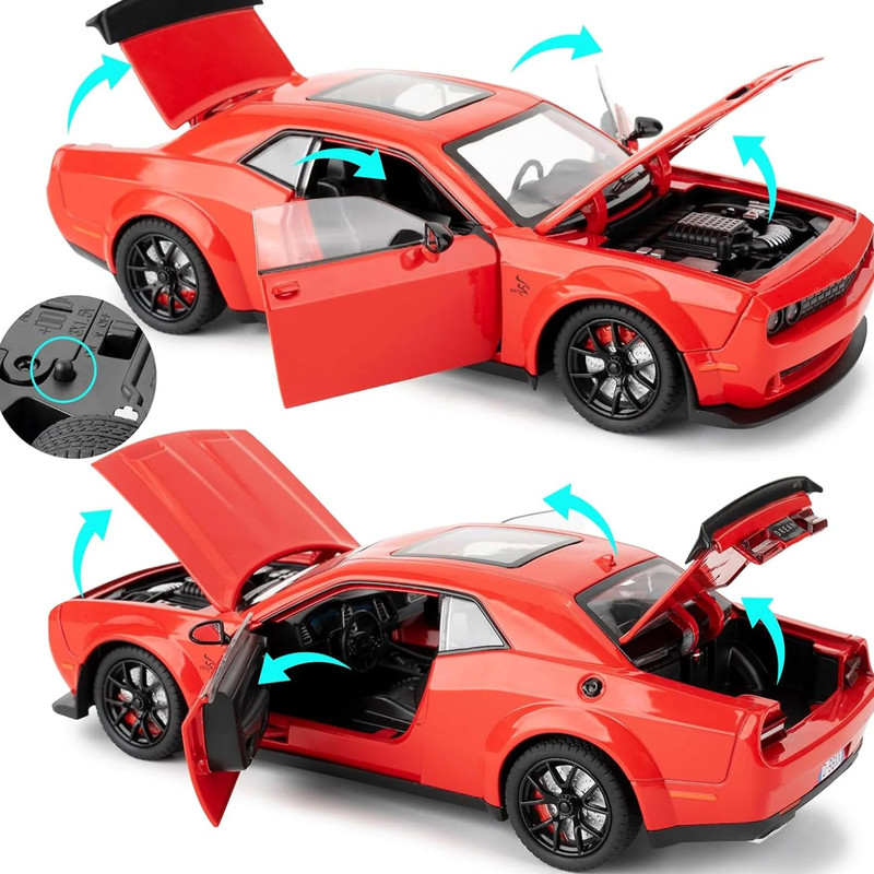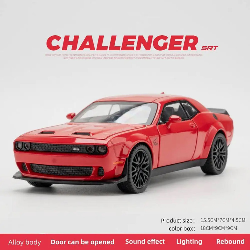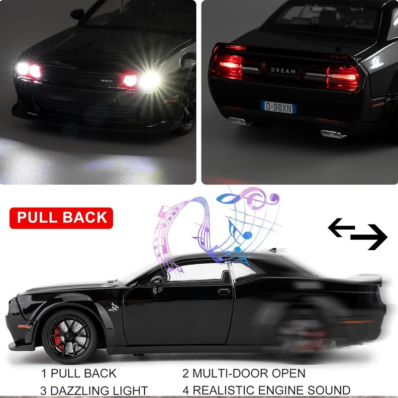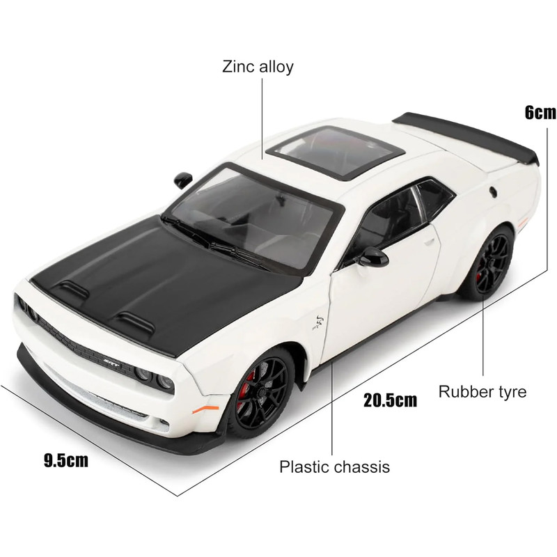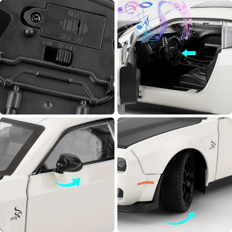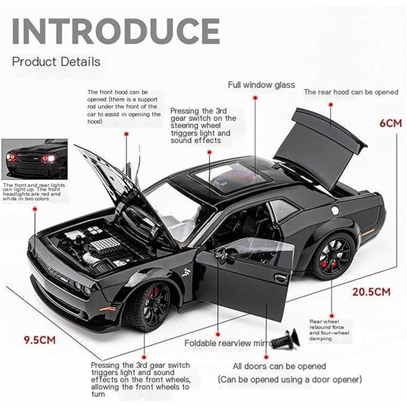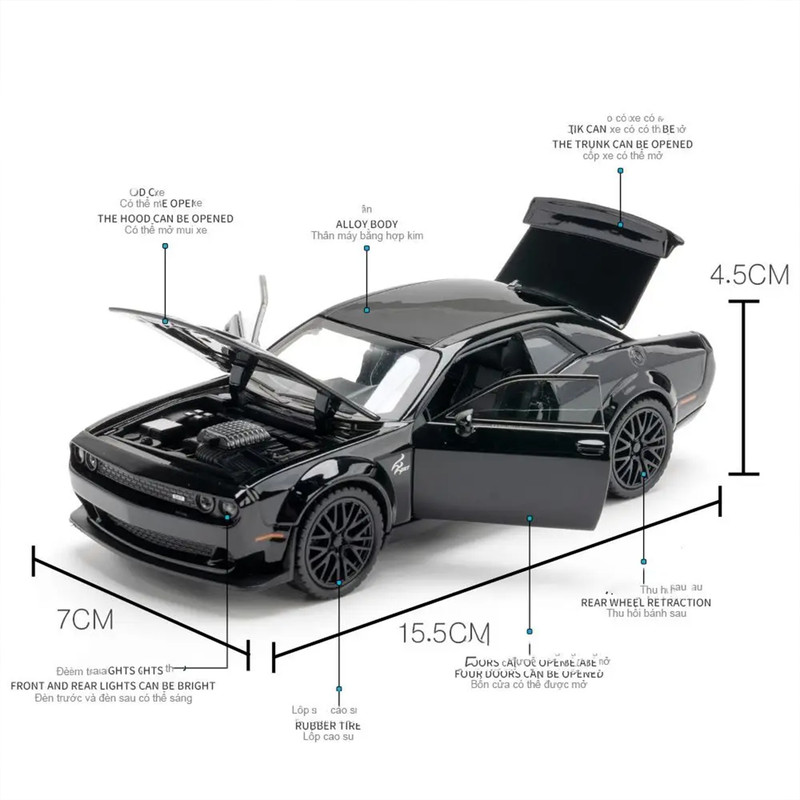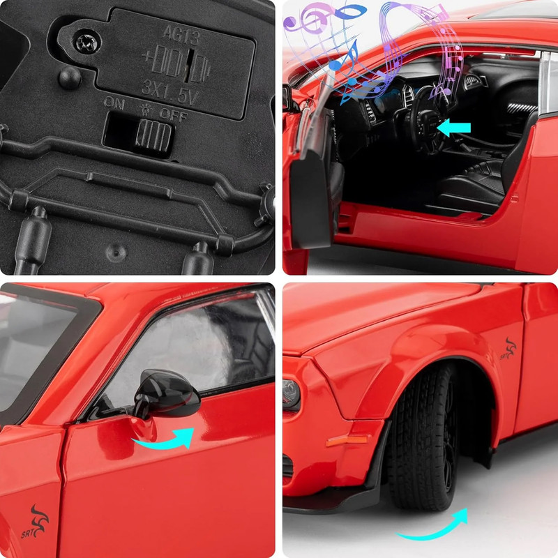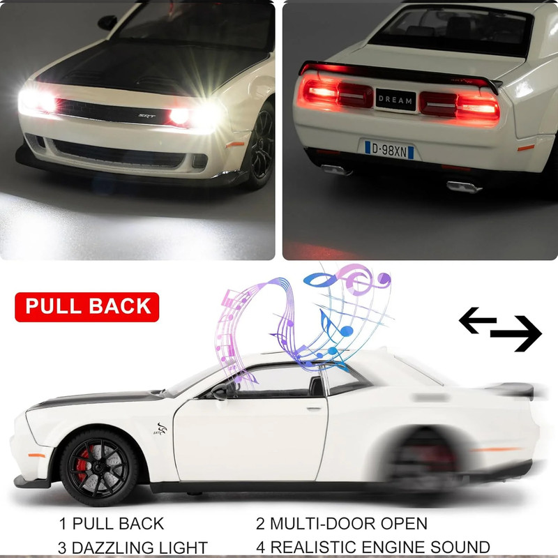دوج چلنجر فلزی مقیاس 1:24 (24 برابر کوچکتر از خودروی واقعی) چهار درب باز شو -آینه تاشو - چراغ دار - چند افکت موسیقی - دارای فنر بندی - بوق روی فرمان - دکمه سه حالته - دارای دکمه چراغ ثابت عقب کش - دارای لاستیک مخصوص باز کردن درب ها - نکته : محصول فوق فاقد جعبه مقوایی میباشد