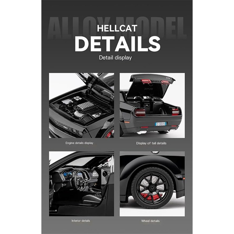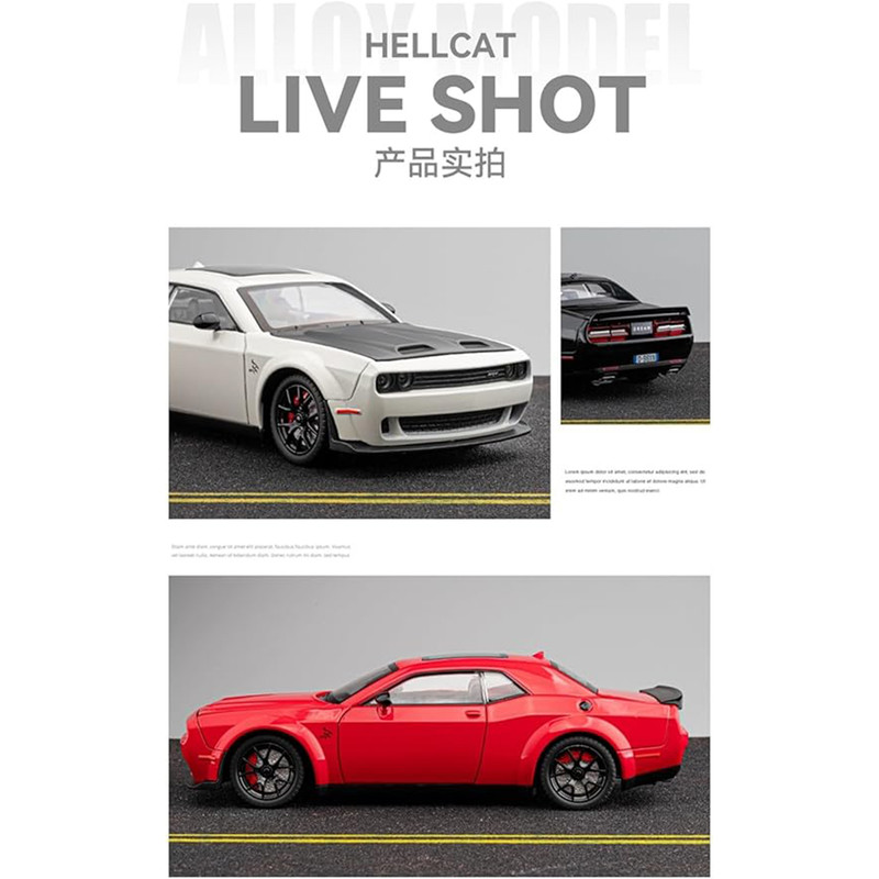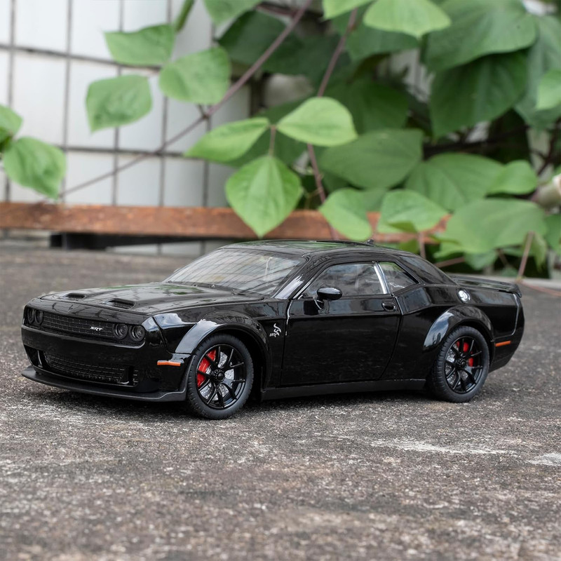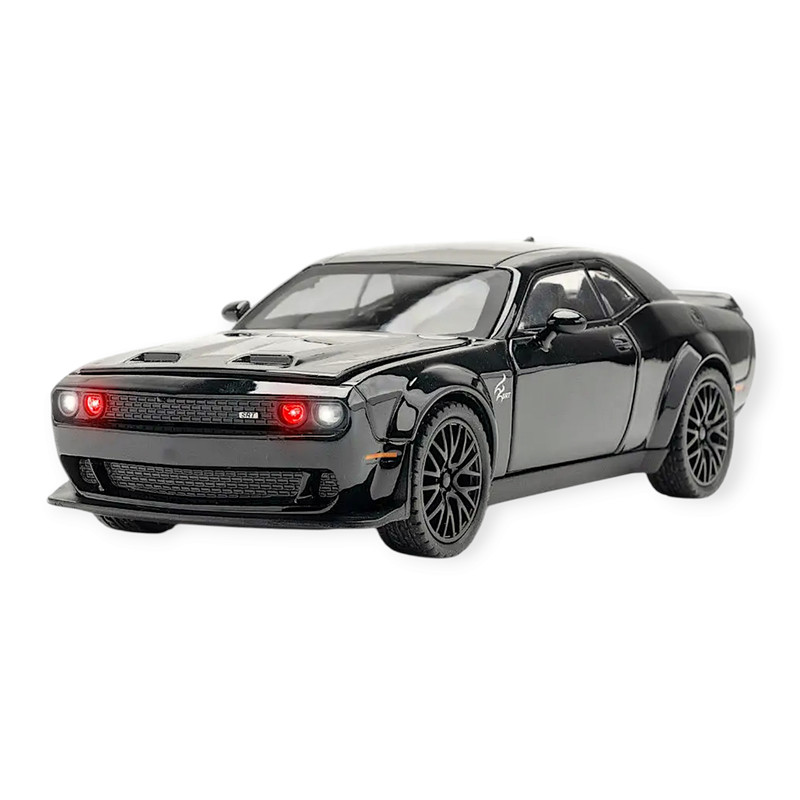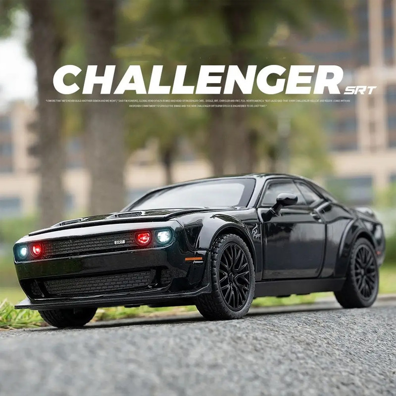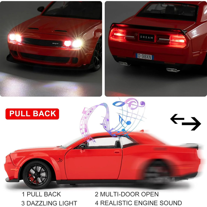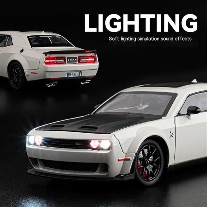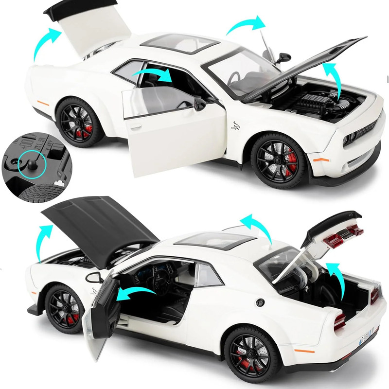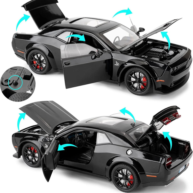 دوج چلنجر فلزی مقیاس 1:24 (24 برابر کوچکتر از خودروی واقعی) چهار درب باز شو -آینه تاشو - چراغ دار - چند افکت موسیقی - دارای فنر بندی - بوق روی فرمان - دکمه سه حالته - دارای دکمه چراغ ثابت عقب کش - دارای لاستیک مخصوص باز کردن درب ها - نکته : محصول فوق فاقد جعبه مقوایی میباشد