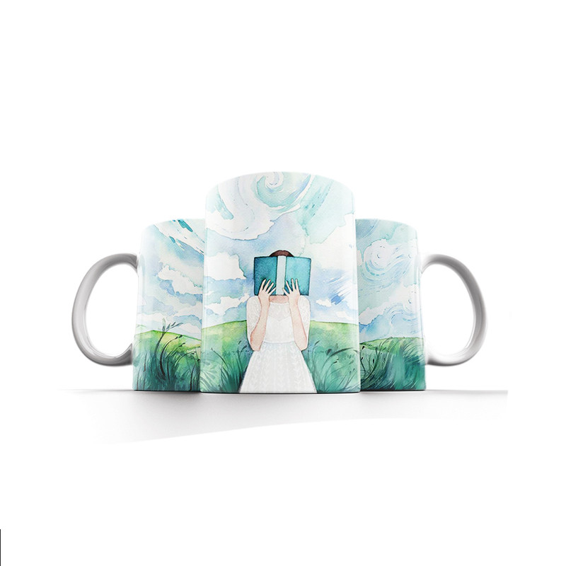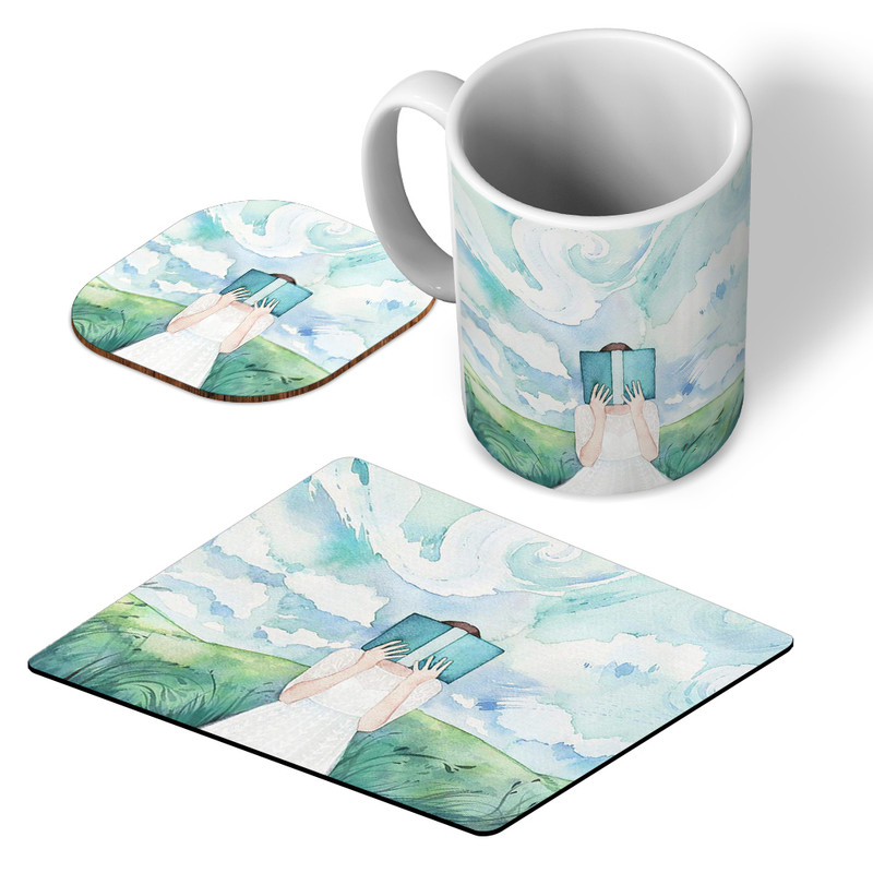 ماگ ترمه طراحان ایده مدل دختر کتابخوان کد cfp1408 همراه با زیر لیوانی و موس پد