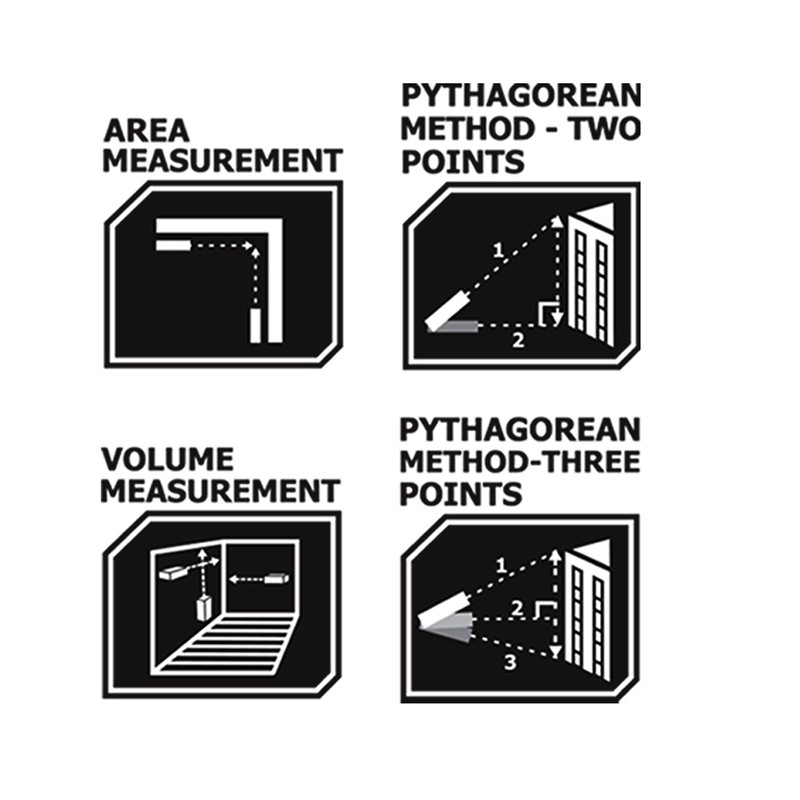ویژگی‌های متر لیزری Class 2 , باتری نیم‌قلمی , قابلیت اندازه‌گیری حجم , قابلیت اندازه‌گیری زاویه , قابلیت اندازه‌گیری مساحت , قابلیت خاموش شدن خودکار , واحد اندازه‌گیری متر