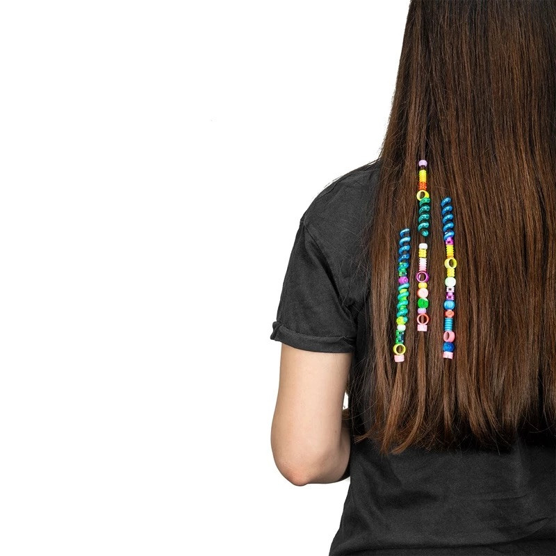 ست بافت مو اسباب بازی شامل یک دستگاه برای تزئین مو و شانه و چندین قطعه که موها را می توان با ان تزئین کرد. این اسباب بازی یک دستگاه برای دختران بالای پنج سال می باشد تا موهای خود را بصورت خاص درست کنند. استفاده از این اسباب بازی بسیار راحت و آسان می باشد و لازم به داشتن سواد و یا تجربه خاص نیست.برای استفاده از این دستگاه بافت مو ابتدای کمی از مو خود را جدا کنید و داخل نوک دستگاه قرار دهید و حلقه های که دوست دارید با ان موهای خود را تزئین کنید برروی میله نوک دستگاه قرار دهید و دستگاه را روشن کنید و آرام به سمت پایین بکشید تا حلقه ها وارد مو بشوند و آرام از موها جدا کنید. با فشار دادن دسته صورتی روی دستگاه، میله بالای دستگاه به سمت بالا می آید و حلقه ها را وارد موها می کند. این اسباب بازی در یک بسته بندی جعبه ای طلقی و جذاب قرار دارد.این اسباب بازی باتری خور نیست و بصورت دستی و مکانیکی کار می کند و موتور برقی در این اسباب بازی استفاده نشده است. جنس اسباب بازی از پلاستیک مرغوب تولید شده که از مواد درجه یک می باشد و حلقه های آن هم از جنس پلاستیکی شیشه ای می باشد که دارای رنگ های بسیار زیبا و شکیل می باشد که می تواند موها شما را به زیبایی تزئین کند.