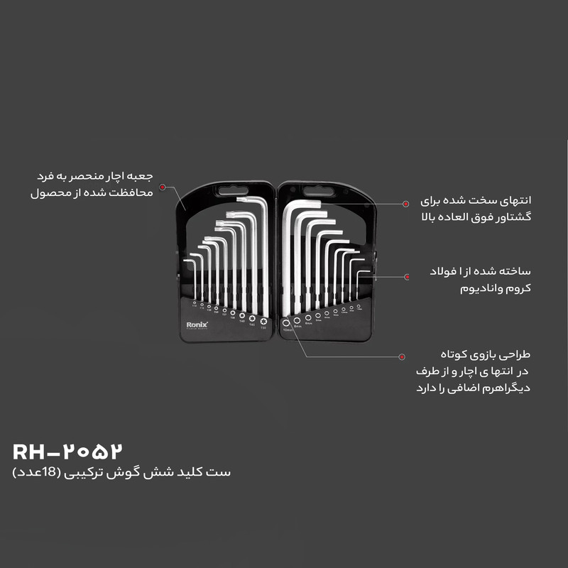 سایر توضیحات | 9 عدد آچار آلن در سایزهای 1.5، 2، 2.5، 3، 4، 5، 6، 8 و 10 میلیمتر - 9 عدد آچار ستارهای درسایزهای T10، T15، T20، T25، T27، T30، T40، T45 و T50 - قابلیت آویزان کردن قاب نگهدارنده - آچارهای با زاویه 90 درجه |