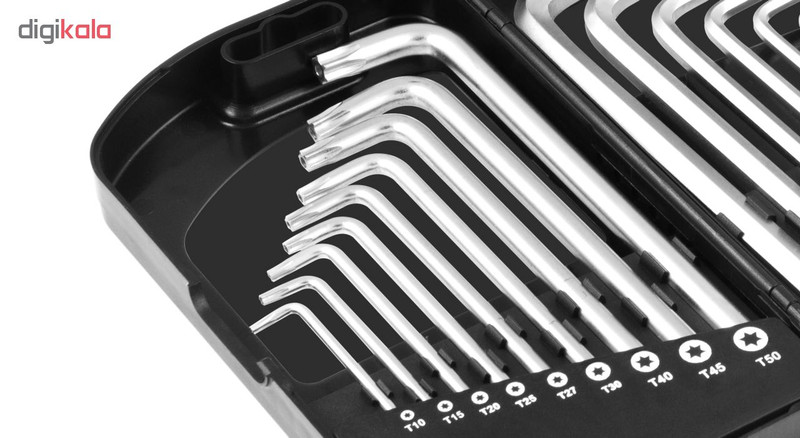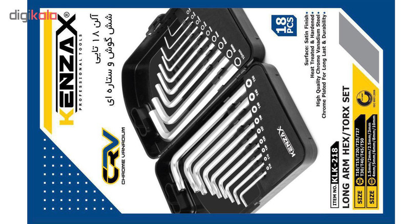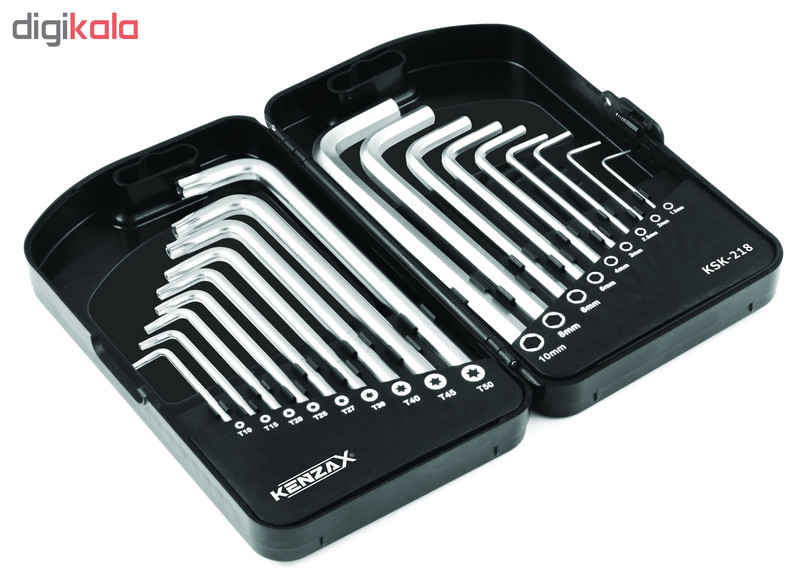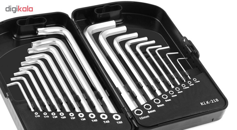 | سایر توضیحات | - 9 عدد آچار آلن در سایزهای 1.5، 2، 2.5، 3، 4، 5، 6، 8 و 10 میلیمتر - 9 عدد آچار ستارهای درسایزهای T10، T15، T20، T25، T27، T30، T40، T45 و T50 - قابلیت آویزان کردن قاب نگهدارنده - آچارهای با زاویه 90 درجه - روکش بدنه : آبکاری کروم مات جهت ماندگاری و طول عمر بیشتر - سخت کاری شده و گرما دیده - دارای طول بلند تر نسبت به مدل KSK-218 (استاندارد) |