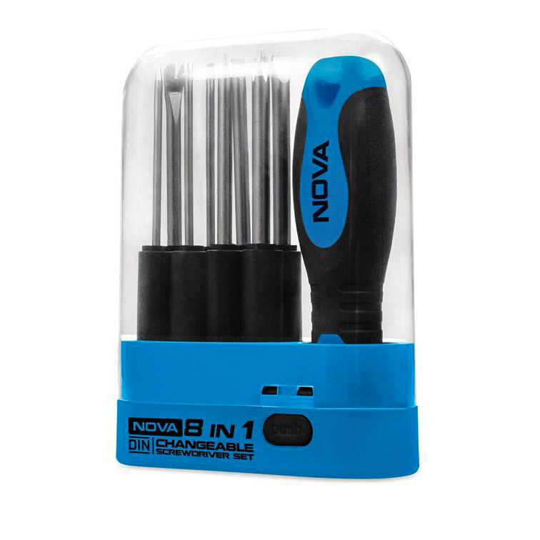 مجوعه پیچ گوشتی 8 عددی نووا(NOVA) یکی از محصولات کاربردی می باشد که توسط این شرکت تولید شده است. این مجموعه شامل یک عدد دسته، سه عدد سری پیچ گوشتی چهارسو(سایز PH2 ، PH1 ، PH0)، سه عدد سری پیچ گوشتی دوسو(سایز SL6.0 ، SL5.0 ، SL3.0)، یک عدد سمبه(سوراخ کن) و یک عدد میخ کش می باشد.