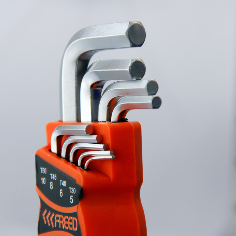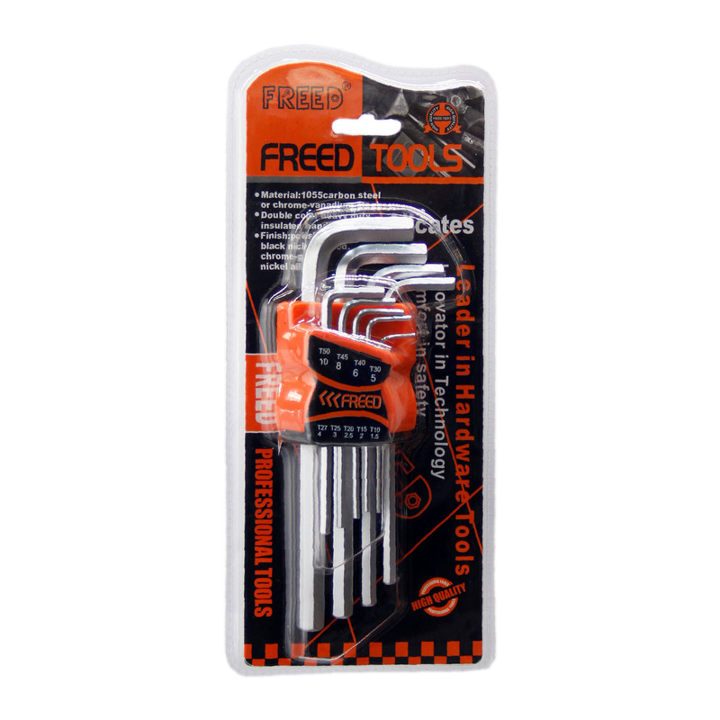 شرکت فرد ( FREED ) به عنوان یکی از بزرگترین سازنده های برتر آچارآلات و ابزارآلات دستی در کشور چین است که از بهترین مواد موجود برای کارکردی حرفه ای و دوام بالا تولید شده است .مجموعه 9 عددی فوق از محصولات شرکت فرد ( FREED ) می باشد که از 9 آلن بلند از سایزهای T10 تا T50 تشکیل شده است . تمامی آلن های این مجموعه از فولاد کروم وانادیم ساخته شده و مقاومت خوبی دربرابر ضربه و خوردگی دارند..این مجموعه روی نگه دارنده کشویی قلاب دار از جنس پلاستیک مقاوم قرار گرفته است.