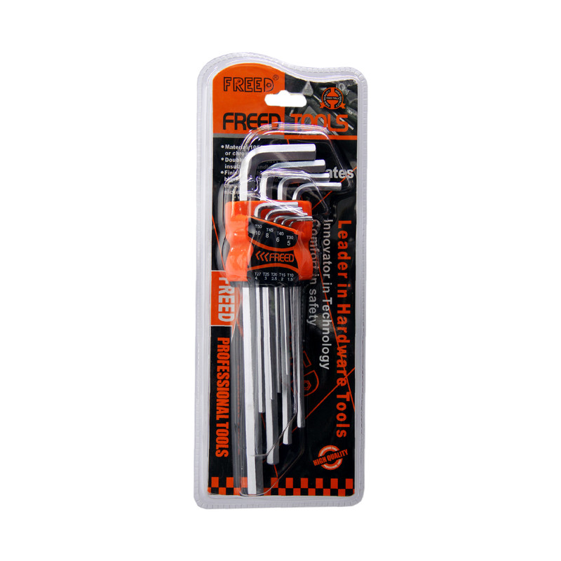 شرکت فرد ( FREED ) به عنوان یکی از بزرگترین سازنده های برتر آچارآلات و ابزارآلات دستی در کشور چین است که از بهترین مواد موجود برای کارکردی حرفه ای و دوام بالا تولید شده است .مجموعه 9 عددی فوق از محصولات شرکت فرد ( FREED ) می باشد که از 9 آلن فوق بلند از سایزهای T10 تا T50 تشکیل شده است . تمامی آلن های این مجموعه از فولاد کروم وانادیم ساخته شده و مقاومت خوبی دربرابر ضربه و خوردگی دارند..این مجموعه روی نگه دارنده کشویی قلاب دار از جنس پلاستیک مقاوم قرار گرفته است.