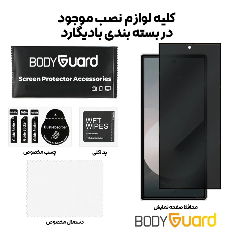 | اقلام همراه | گلس پرایوسی - دستمال تمیز کننده - پد الکلی - چسب مخصوص گرد و غبار |