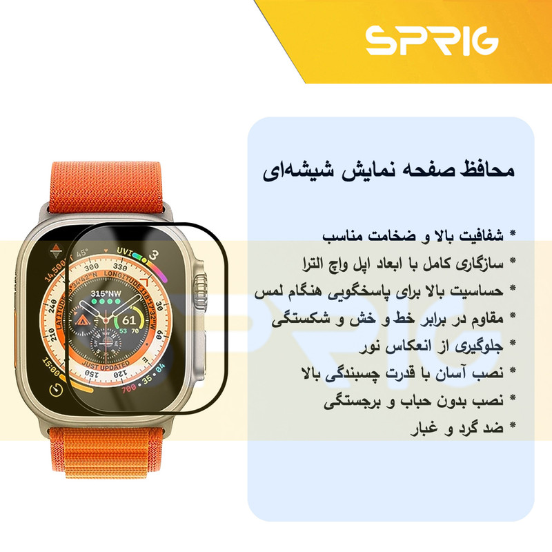 محافظ صفحه نمایش شیشهای SH-FULL سازگاری کامل با ابعاد صفحه نمایش ساعت الترا دارد و در برابر خط و خش مقاوم بوده و برای استفادهی روزمره بسیار مناسب است. شفافیت بالای این گلس موجب میشود از کیفیت تصویر و وضوح صفحه نمایش بهره مند شوید. ضخامت مناسبی دارد که سبب میشود حساسیت لمسی صفحه نمایش به طور کامل حفظ شود. مواد با کیفیت به کار رفته در این محصول باعث میشود که مقاومت بالایی در برابر ضربه و شکستگی داشته باشد. همچنین نصب این محصول بسیار آسان بوده و به علت چسبندگی بالا به هنگام نصب حباب و برجستگی اضافه روی صفحه نمایش ساعت شما به وجود نخواهد آمد و محافظ به طور دقیق روی ساعت میچسبد.