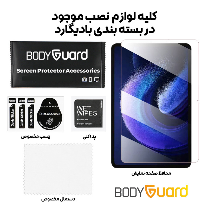 با توجه به اندازه بزرگ صفحه نمایش تبلت ها شرکت بادیگارد اقدام به تولید محافظ صفحه کرده که علاوه بر پوشش تمام صفحه نمایش مقاومت زیادی در برابر آسیب ها داشته باشد و کیفیت صفحه نمایش را کم نکند. این محصول گلس شیشه ای بادیگارد مناسب برای شیائومی Xiaomi Pad 6 , Xiaomi Pad 6 Pro می باشد.
