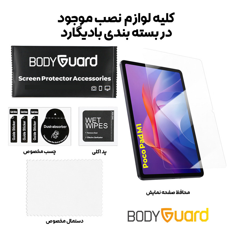 محافظ صفحه نمایش تبلت Xiaomi Poco Pad M1 12.1 inch از برند بادیگارد با طراحی دقیق و کیفیت ساخت بالا، محافظتی مؤثر و همهجانبه را برای نمایشگر این تبلت فراهم میکند. این گلس با استفاده از مواد مقاوم در برابر خط و خش، از صفحه نمایش در برابر آسیبهای روزمره مانند برخورد با اشیای تیز، ضربههای سطحی و گردوغبار محافظت میکند. شفافیت بالا و ضخامت کم آن باعث میشود وضوح تصویر و حساسیت لمسی تبلت حفظ شود و تجربهای روان و بینقص ارائه دهد. همچنین این محافظ با تکنولوژی ضد حباب تولید شده تا نصب آن بدون دردسر و بدون ایجاد لک یا حباب هوا انجام شود. در بستهبندی رسمی بادیگارد، تمام ابزارهای لازم برای نصب دقیق و آسان از جمله دستمال مخصوص، چسب راهنما، پد الکلی و برچسب جاذب گردوغبار موجود است. این گلس بهطور کامل با صفحهنمایش تبلت Xiaomi Poco Pad M1 12.1 inch هماهنگ بوده و بدون تداخل با قاب یا کاورهای محافظ، از لبه تا لبه محافظت میکند. انتخابی ایدهآل برای کسانی که همزمان بهدنبال دوام، زیبایی و کارایی هستند.