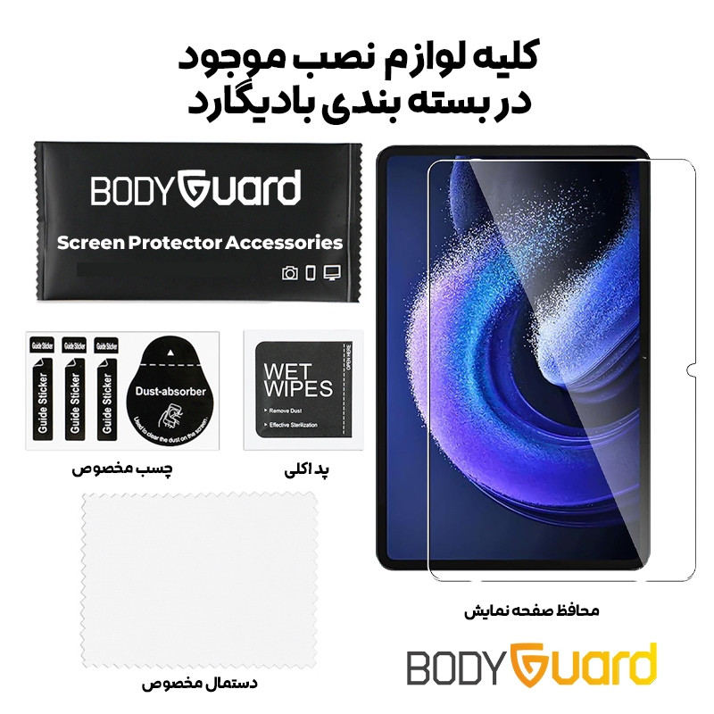 با توجه به اندازه بزرگ صفحه نمایش تبلت ها شرکت بادیگارد اقدام به تولید محافظ صفحه کرده که علاوه بر پوشش تمام صفحه نمایش مقاومت زیادی در برابر آسیب ها داشته باشد و کیفیت صفحه نمایش را کم نکند. این محصول گلس شیشه ای بادیگارد مناسب برای شیائومی Pad 6 Max 14 می باشد.