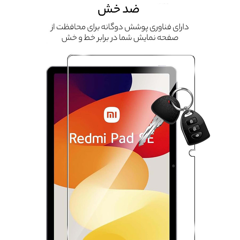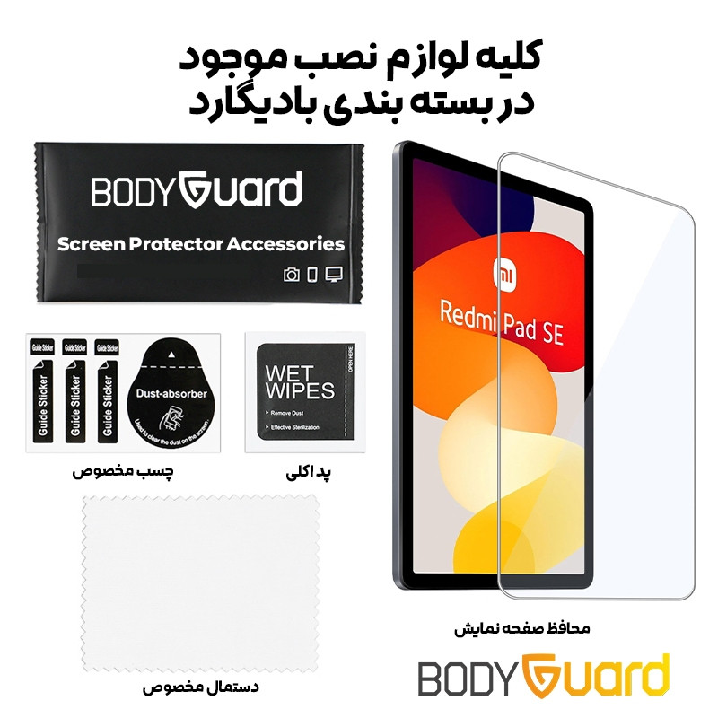 با توجه به اندازه بزرگ صفحه نمایش تبلت ها شرکت بادیگارد اقدام به تولید محافظ صفحه کرده که علاوه بر پوشش تمام صفحه نمایش مقاومت زیادی در برابر آسیب ها داشته باشد و کیفیت صفحه نمایش را کم نکند. این محصول گلس شیشه ای بادیگارد مناسب برای شیائومی Redmi Pad SEمی باشد.