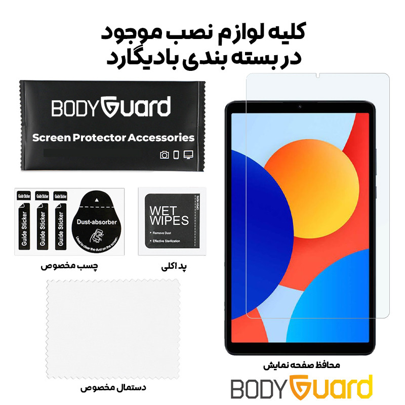 با توجه به اندازه بزرگ صفحه نمایش تبلت ها شرکت بادیگارد اقدام به تولید محافظ صفحه کرده که علاوه بر پوشش تمام صفحه نمایش مقاومت زیادی در برابر آسیب ها داشته باشد و کیفیت صفحه نمایش را کم نکند. این محصول گلس شیشه ای بادیگارد مناسب برای شیائومی Redmi Pad SE 8.7 می باشد و مناسب Redmi Pad SE 11 نمی باشد.