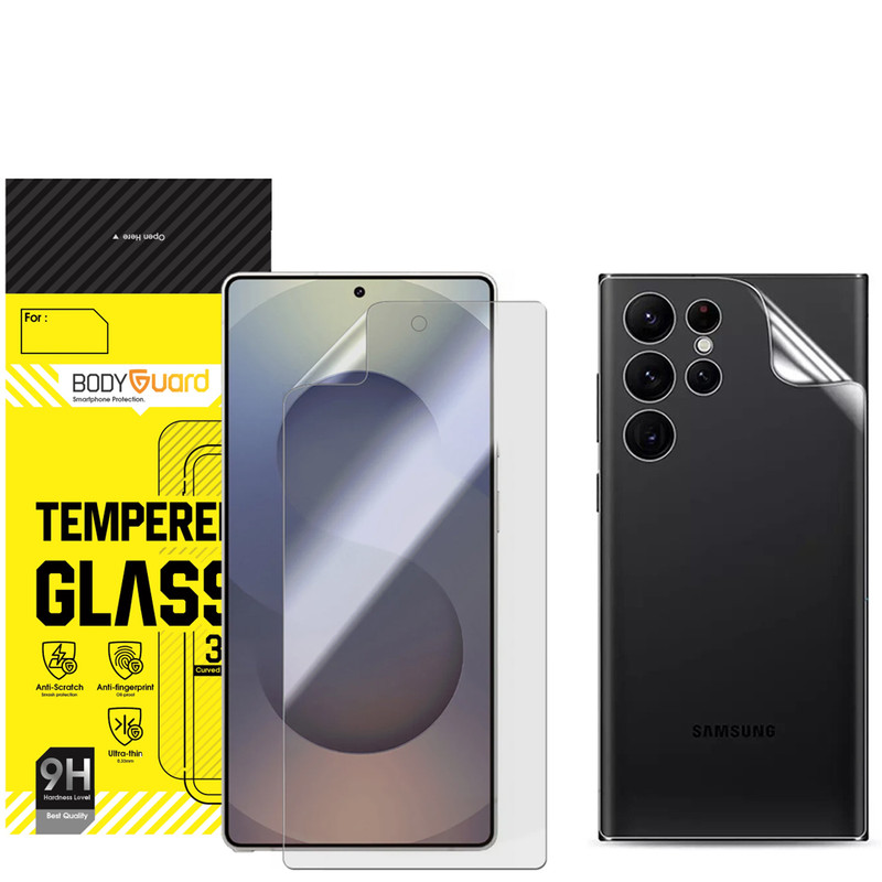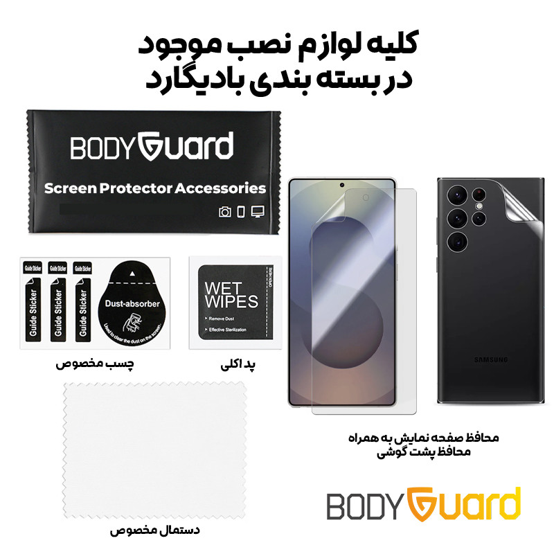 | اقلام همراه | گلس هیدروژلی مات برای پشت و روی گوشی - پد الکلی - چسب پرزگیر - دستمال پارچه ای - کاردک |