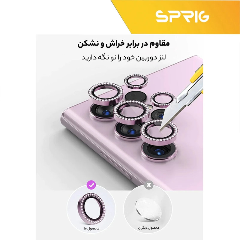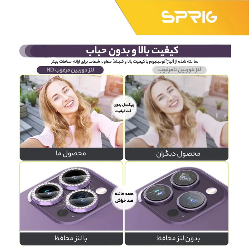 محافظ لنز دوربین رینگی اسپریگ با در نظر گرفتن دو جنبه ی زیبایی و حفاظت، یک محافظ تمام عیار برای لنز دوربین میباشد. این محافظ برای دوربین اصلی طراحی شده است تا آن را از خط و خش، شکستگی و آسیب های احتمالی دیگر حفظ کند و مانع از نشستن هر گونه لک و چربی روی لنز و در نتیجه افت کیفیت دوربین شما می شود. با وجود نصب آسانی که دارد میتوانید به راحتی آن را روی دوربین گوشی خود نصب کنید و نگران ماندن رد این گلس روی دوربین به هنگام جدا کردن آن نباشید چراکه هیچ ردی روی شیشه دوربین برجای نمی گذارد و پس از جدا کردن آن، دوربین مثل روز اولش خواهد بود. در نهایت اینکه این محافظ لنز تاثیری روی لنز دوربین و کیفیت تصاویر یا فیلم های ثبت شده ندارد و می توانید با خیال راحت از آن استفاده کنید.