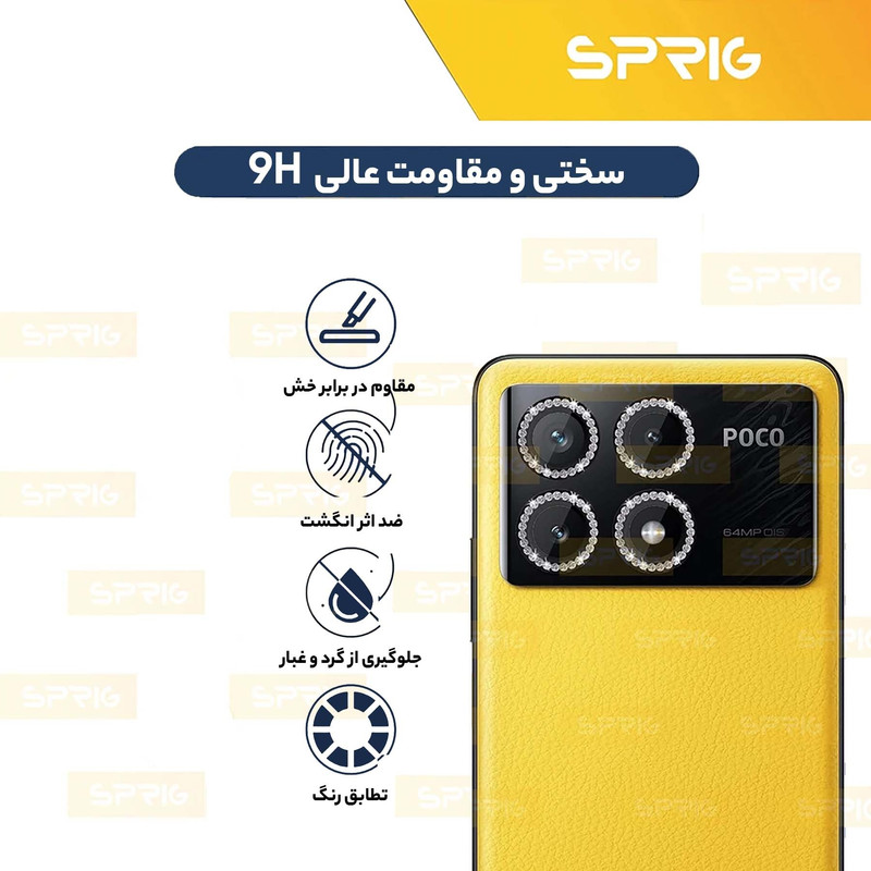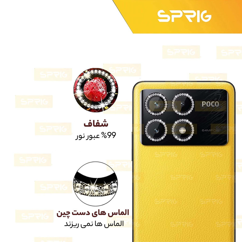 محافظ لنز دوربین رینگی نگین دار اسپریگ با در نظر گرفتن دو جنبه ی زیبایی و حفاظت، یک محافظ تمام عیار برای لنز دوربین میباشد. این محافظ برای دوربین اصلی طراحی شده است تا آن را از خط و خش، شکستگی و آسیب های احتمالی دیگر حفظ کند و مانع از نشستن هر گونه لک و چربی روی دوربین شود. با وجود نصب آسانی که دارد میتوانید به راحتی آن را روی دوربین گوشی خود نصب کنید و نگران ماندن رد این گلس روی دوربین به هنگام جدا کردن آن نباشید چرا که هیچ ردی روی شیشه دوربین برجای نمی گذارد و پس از جدا کردن آن، دوربین مثل روز اولش خواهد بود. در نهایت اینکه این محافظ لنز تاثیری روی لنز دوربین و کیفیت تصاویر یا فیلم های ثبت شده ندارد و می توانید با خیال راحت از آن استفاده کنید.