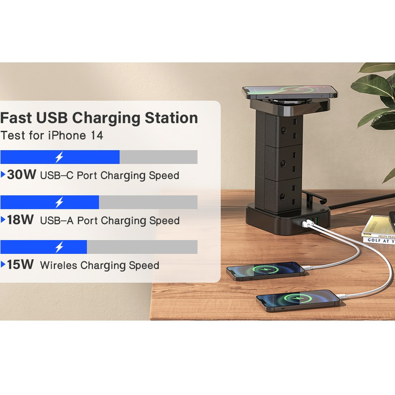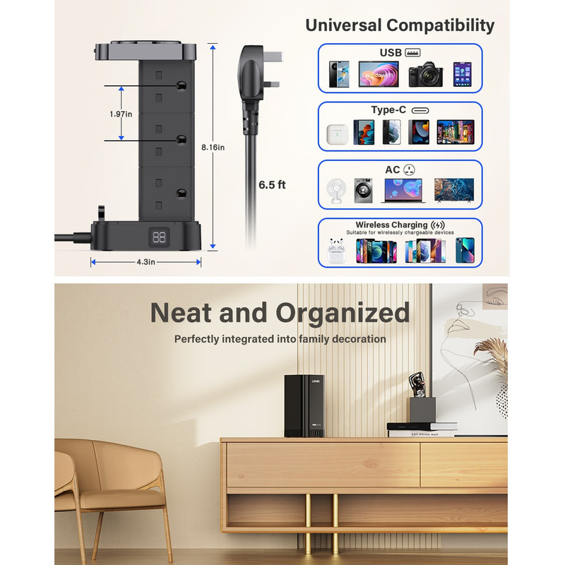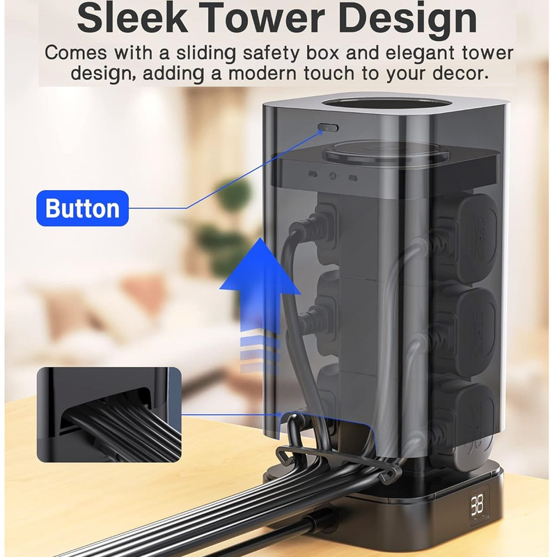 طراحی برج مانند و شیک : برخلاف محصولات مشابه موجود در بازار، این افزونه برق با کابل ۲ متری، دارای یک جعبه ایمنی کشویی کاربردی و طراحی برج مانند زیبا است که ضمن محافظت از کابل‌ها و پریز برق در برابر دستان کنجکاو کودک یا حتی حیوانات خانگی، جلوه‌ای مدرن به دکوراسیون شما می‌بخشد!