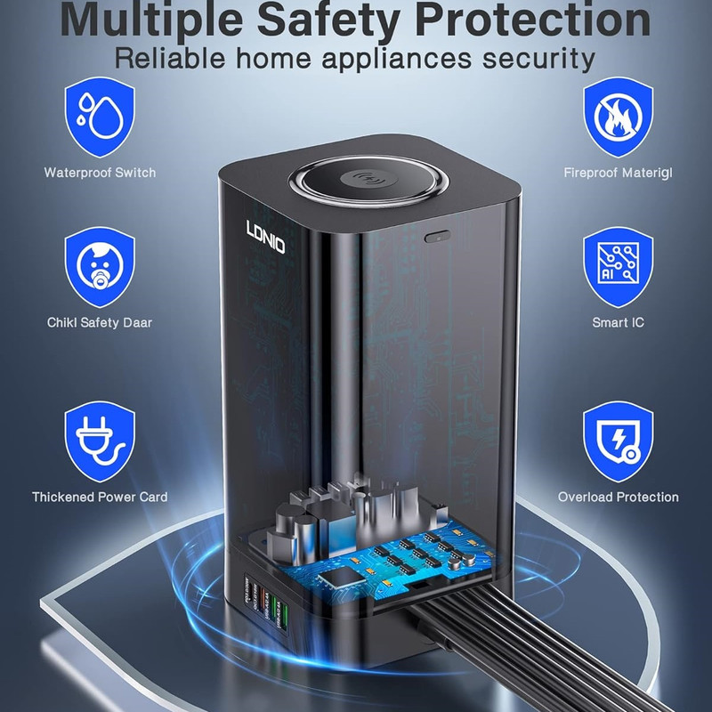 سایر توضیحات حفاظت در برابر نوسانات برق با سرب در دکل LDNIO انتخابی ایده‌آل برای خانه، مسافرت و محل کار! مشخصات: رابط شارژ: ۶ پریز برق و ۴ پورت USB و شارژر بی‌سیم طول سیم برق: 2 متر / 6.56 فوت ولتاژ نامی: 100 ولت - 240 ولت حداکثر خروجی: ۲۵۰۰ وات / ۱۰ آمپر خروجی شارژ بی‌سیم: حداکثر ۱۵ وات Qi TX خروجی USB-C PD: حداکثر 30 وات خروجی کنترل کیفیت USB-A1: حداکثر ۱۸ وات خروجی USB-A2/A3: حداکثر 12 وات جنس: ABS + مواد نسوز محافظت در برابر ولتاژ بیش از حد محافظت در برابر جریان بیش از حد محافظت در برابر اضافه بار حفاظت در برابر اتصال کوتاه محافظت ضد الکتریسیته ساکن حفاظت زمین شده محافظت با سپر الکترومغناطیسی محافظت در برابر دمای بیش از حد
