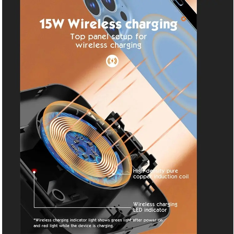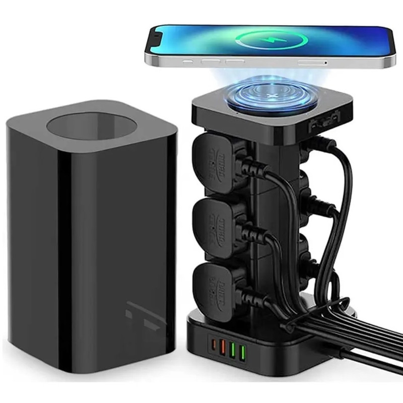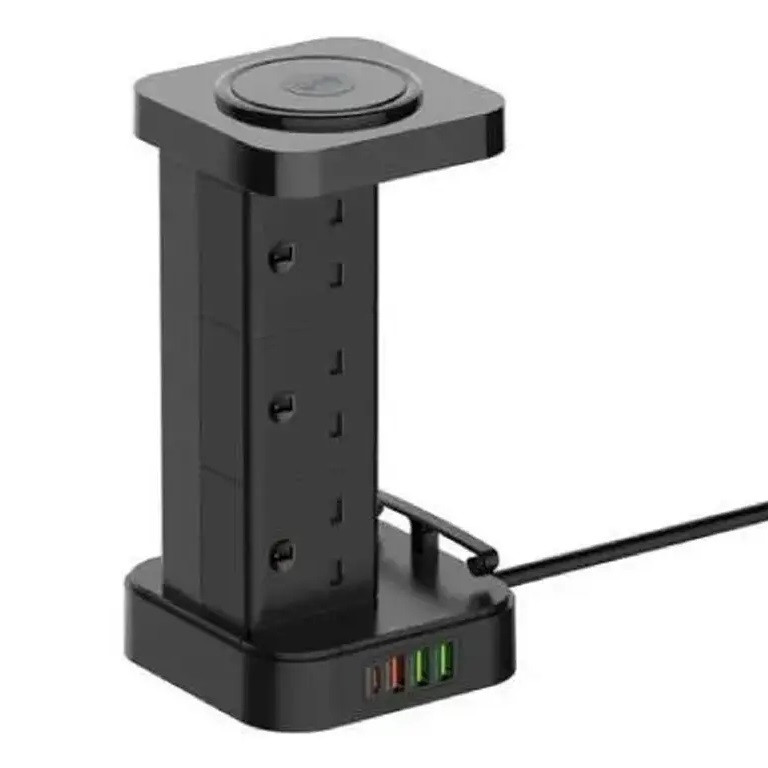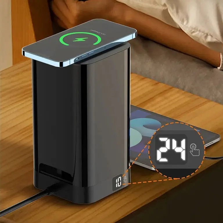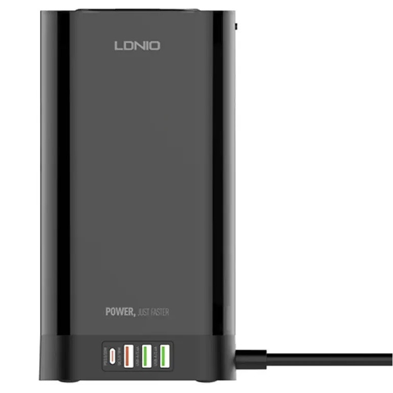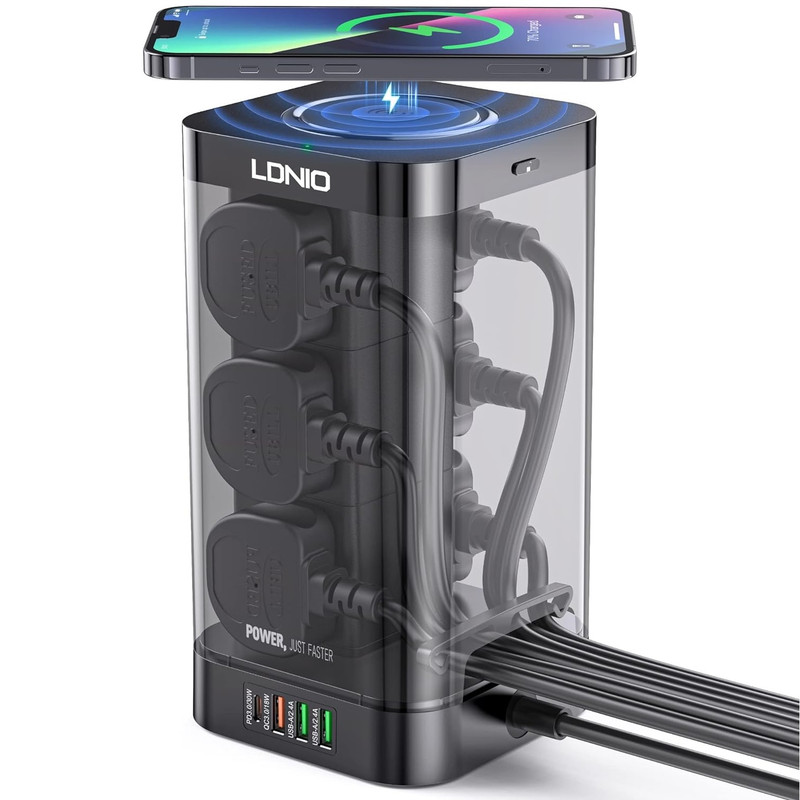 شارژ بی‌سیم : برخلاف سایر پریزهای چندشاخه، شارژر بی‌سیم LDNIO Qi شامل یک شارژر بی‌سیم ۱۵ واتی در قسمت بالایی است. این ایستگاه شارژ بی‌سیم با تلفن‌های دارای فناوری Qi و سایر دستگاه‌ها (برخی دستگاه‌ها به آداپتور نیاز دارند) کار می‌کند. دیگر نیازی به نگرانی در مورد کابل‌ها نیست، زیرا می‌توانید تلفن خود را به سادگی با قرار دادن آن روی پد شارژ بی‌سیم شارژ کنید.