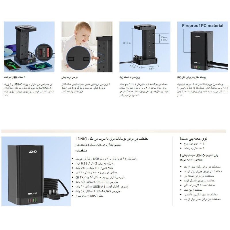 کابل افزایش طول ۱۱ در ۱ : کابل افزایش طول USB LDNIO با سیم رابط برق ۲ متری در جهات مختلف، ۴ پورت USB و شارژ بی‌سیم Qi می‌تواند ۱۱ وسیله الکترونیکی مانند کامپیوتر، تلفن همراه، آی‌پد، MP3، دوربین دیجیتال، تبلت را همزمان شارژ کند. با طراحی برجی می‌توانید کابل خود را مرتب کنید و به دستگاه‌های USB خود شارژی ایمن‌تر و سریع‌تر بدهید! فضایی منظم و مرتب ایجاد کنید. شارژ بی‌سیم : برخلاف سایر پریزهای چندشاخه...