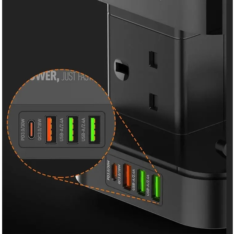 شارژ هوشمند USB : پاوربانک رومیزی دارای ۴ پورت USB (حداکثر خروجی ۳.۰ آمپر/۳۲ وات در مجموع. توان خروجی USB-C حداکثر ۳۲ وات، USB-A حداکثر ۱۸ وات) است. با تنظیم خودکار نرخ شارژ توسط آی‌سی هوشمند، می‌تواند دستگاه‌های شما را به طور خودکار شناسایی کرده و سرعت کار بهینه را ارائه دهد و به شما امکان می‌دهد چندین دستگاه الکترونیکی را همزمان شارژ کنید.