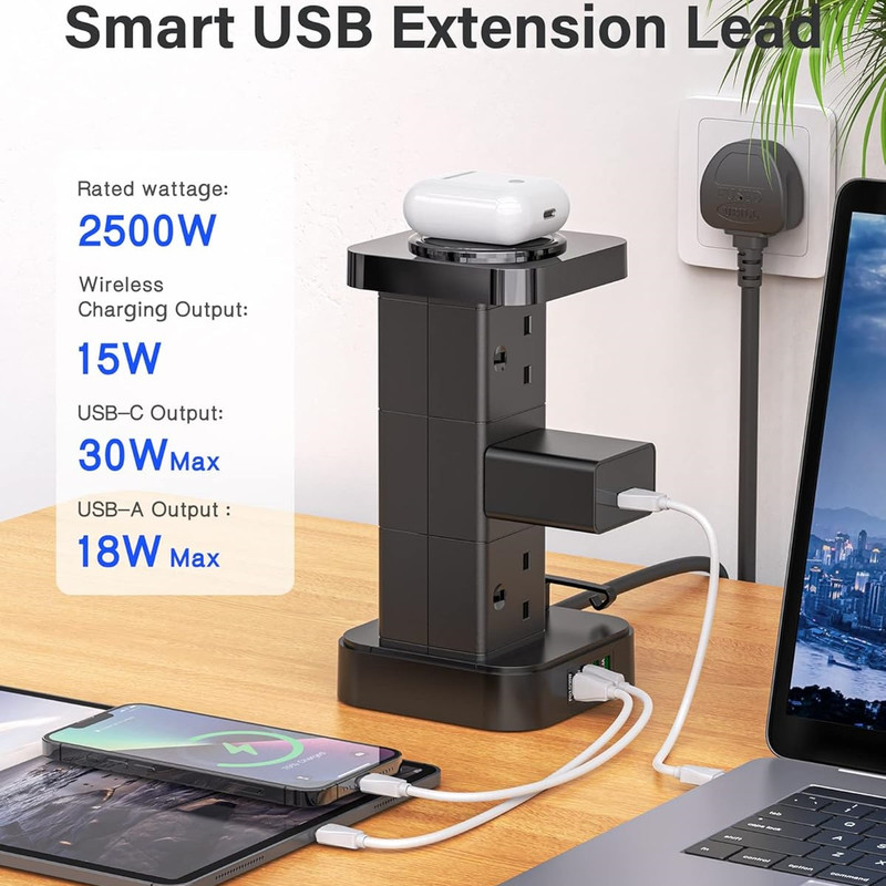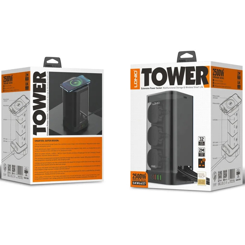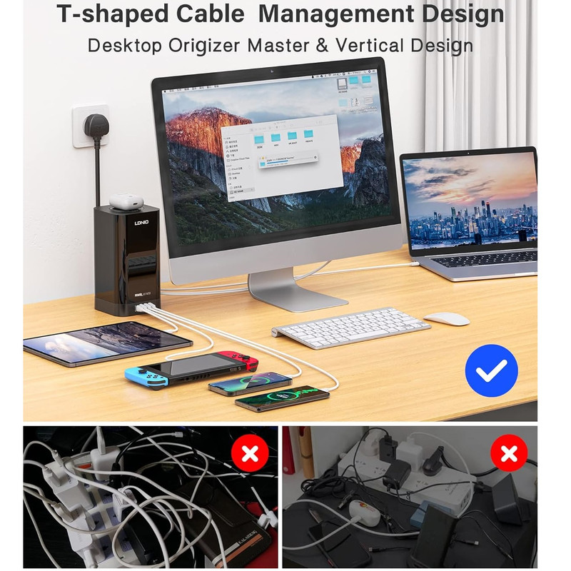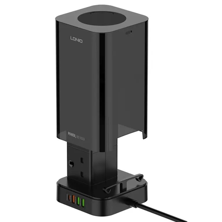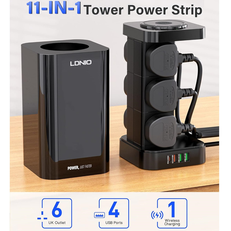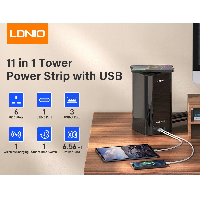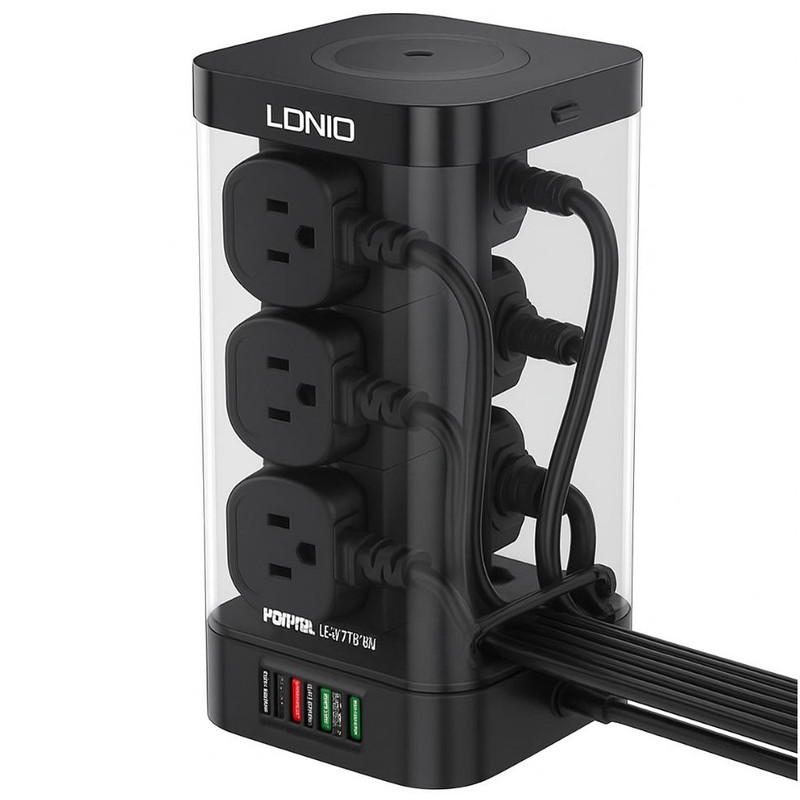 کابل افزایش طول ۱۱ در ۱ : کابل افزایش طول USB LDNIO با سیم رابط برق ۲ متری در جهات مختلف، ۴ پورت USB و شارژ بی‌سیم Qi می‌تواند ۱۱ وسیله الکترونیکی مانند کامپیوتر، تلفن همراه، آی‌پد، MP3، دوربین دیجیتال، تبلت را همزمان شارژ کند. با طراحی برجی می‌توانید کابل خود را مرتب کنید و به دستگاه‌های USB خود شارژی ایمن‌تر و سریع‌تر بدهید! فضایی منظم و مرتب ایجاد کنید.