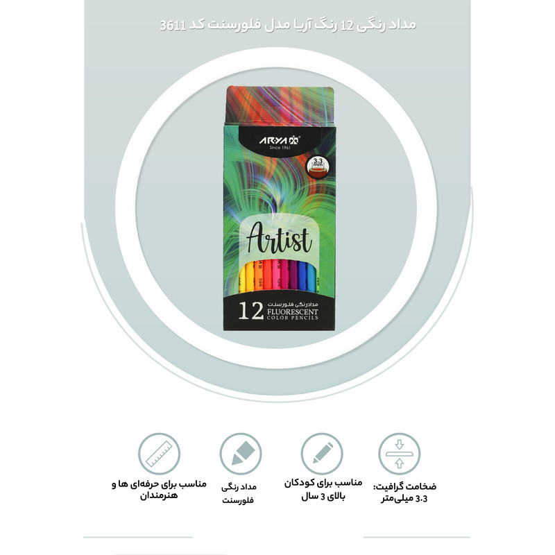 سایر توضیحات | بدنه ساخته شده از جنس چوب باکیفیت و رنگ بهداشتی، قابلیت تراشیدن آسان و طول مداد 170 میلی متر ساخت ایران و دارای استاندارد CE، شامل 12 عدد مداد رنگی در بسته بندی مقوایی دارای نوک نرم و روان به ضخامت 3٫3 میلی متر و مقاوم در برابر شکستگی |